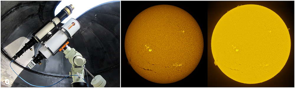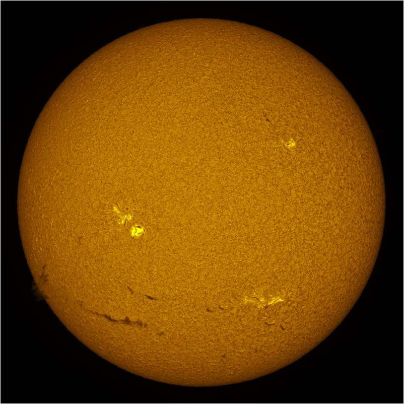 SUN (20210429) WL, CaK & H-alpha (09:00 UTC). TV101 F/5.4, LUNT 1200 CaK Module, SM60, BF30, PGR GRASSHOPPER 3 GS3-U3-28S4