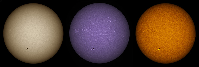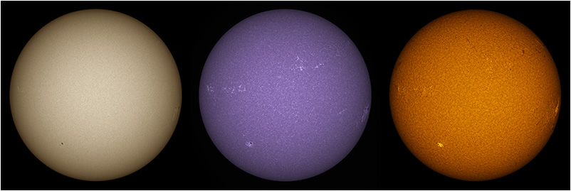 SUN (20210924) WL, CaK & H-alpha (13:30 UTC). TV101 F/5.4, LUNT 1200 CaK Module, SM60, BF30, PGR GRASSHOPPER 3 GS3-U3-28S4