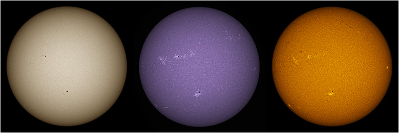 SUN (20210930) WL, CaK & H-alpha (09:30 UTC). TV101 F/5.4, LUNT 1200 CaK Module, SM60, BF30, PGR GRASSHOPPER 3 GS3-U3-28S4