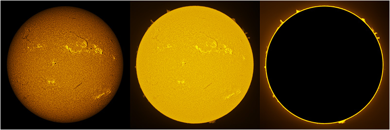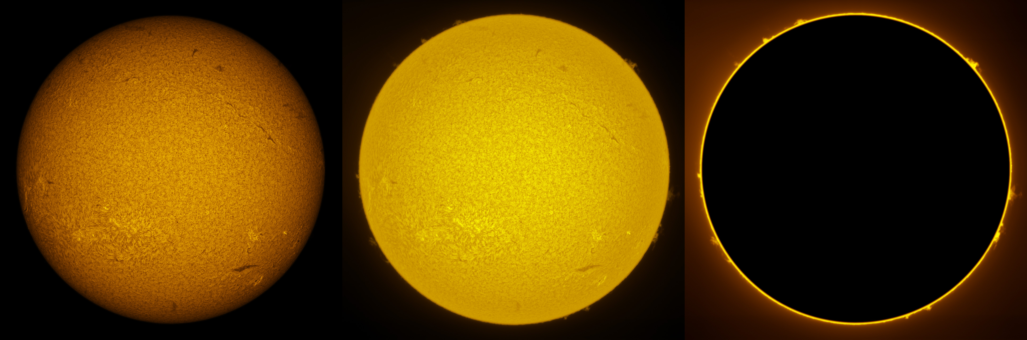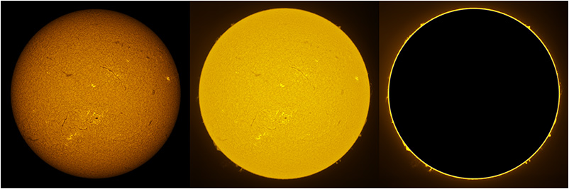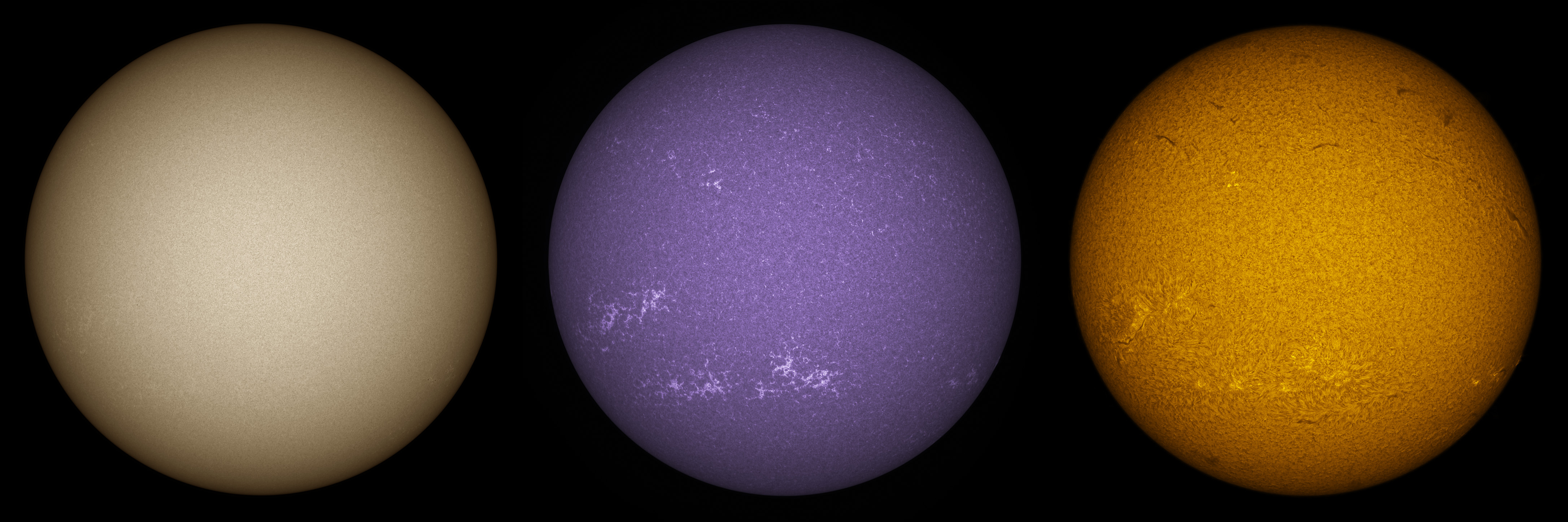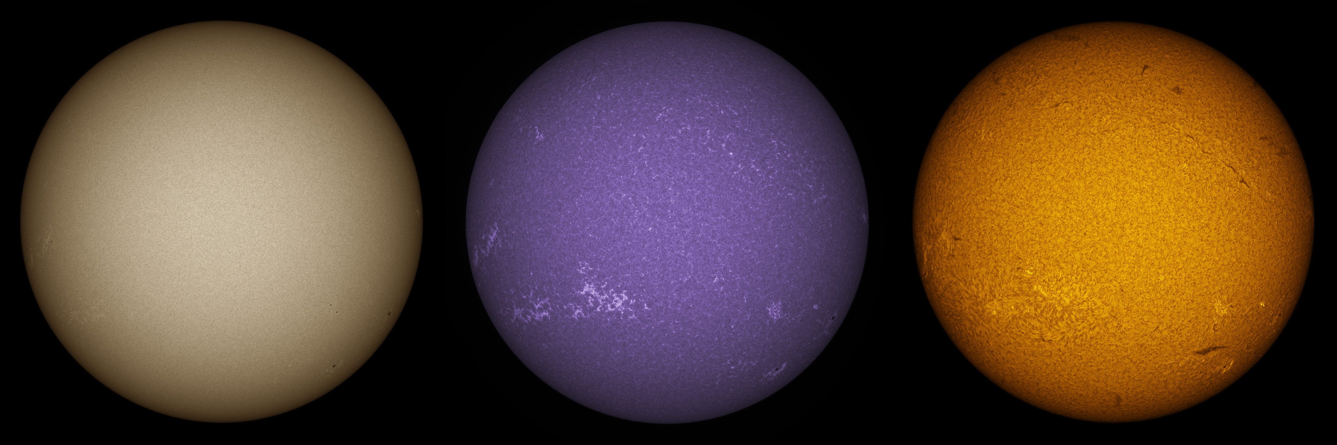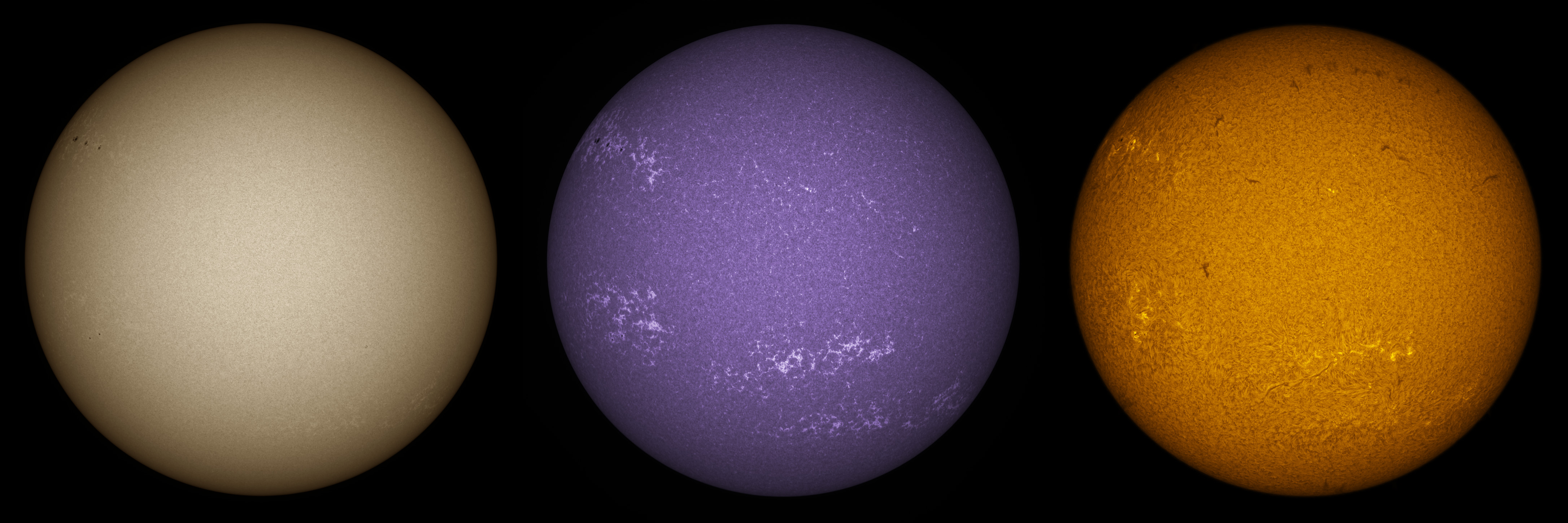 SUN (20220613) WL, CaK & H-alpha (08:00 UTC). TV101 F/5.4, LUNT 1200 CaK Module, SM60, BF30, PGR GRASSHOPPER 3 GS3-U3-28S4M