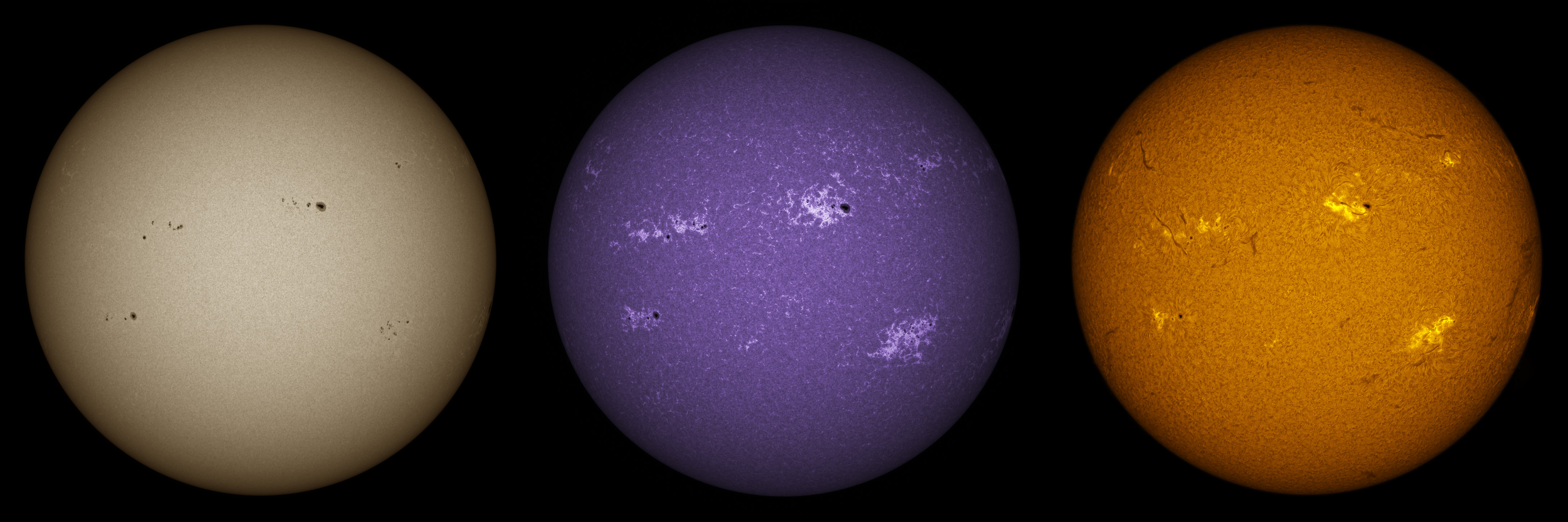 SUN (20220728) WL, CaK & H-alpha (08:30 UTC). TV NP127 F/5.2, LUNT 1200 CaK Module, SM60, BF30, PGR GRASSHOPPER 3 GS3-U3-28S5M