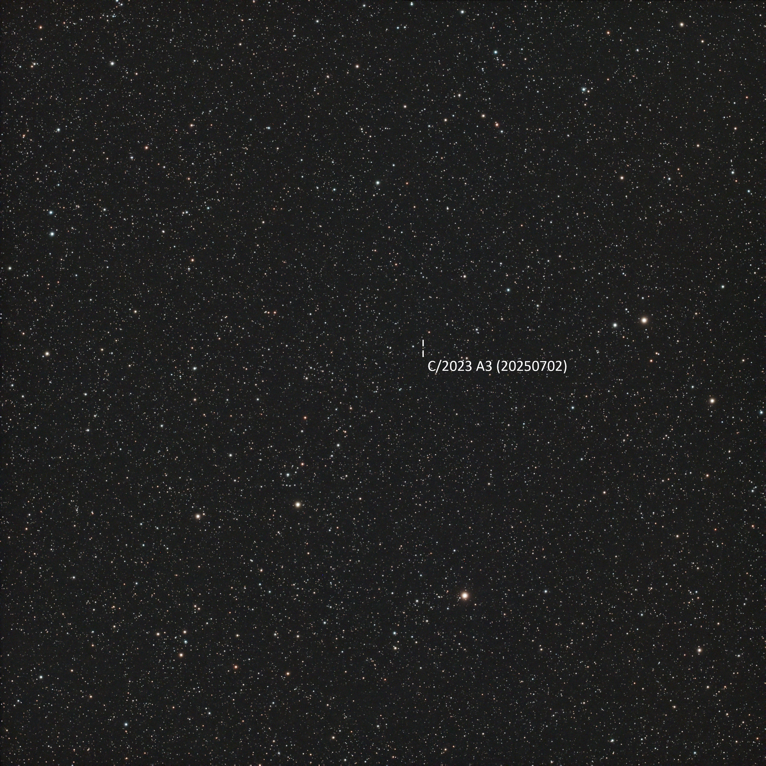 C/2023 A3 Tsuchinshan-ATLAS 20250702 (23:57UTC). ASKAR SQA55, ASI533MC, Antlia Triband RGB Ultra filter, 9X3Min, Paramount ME