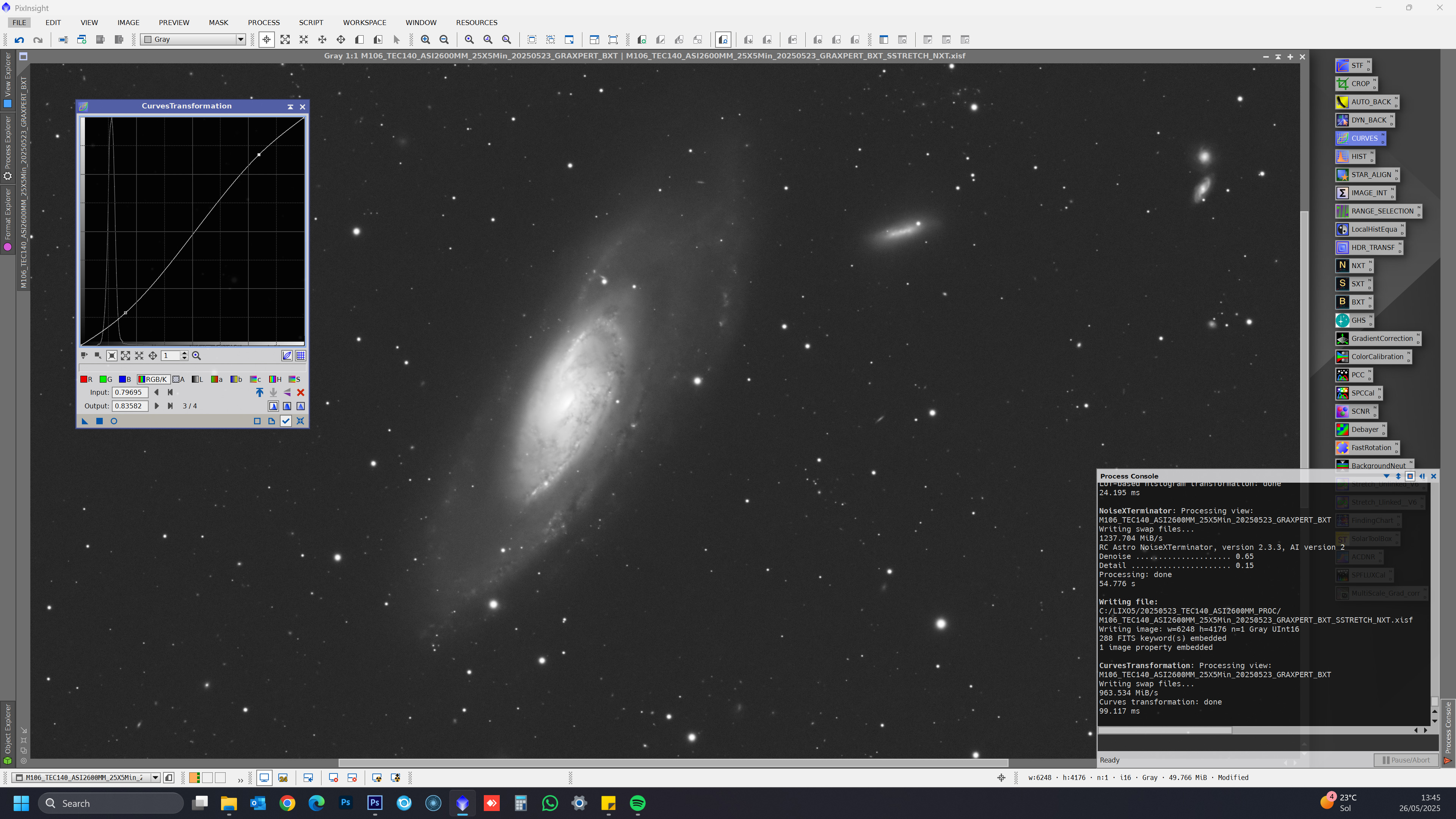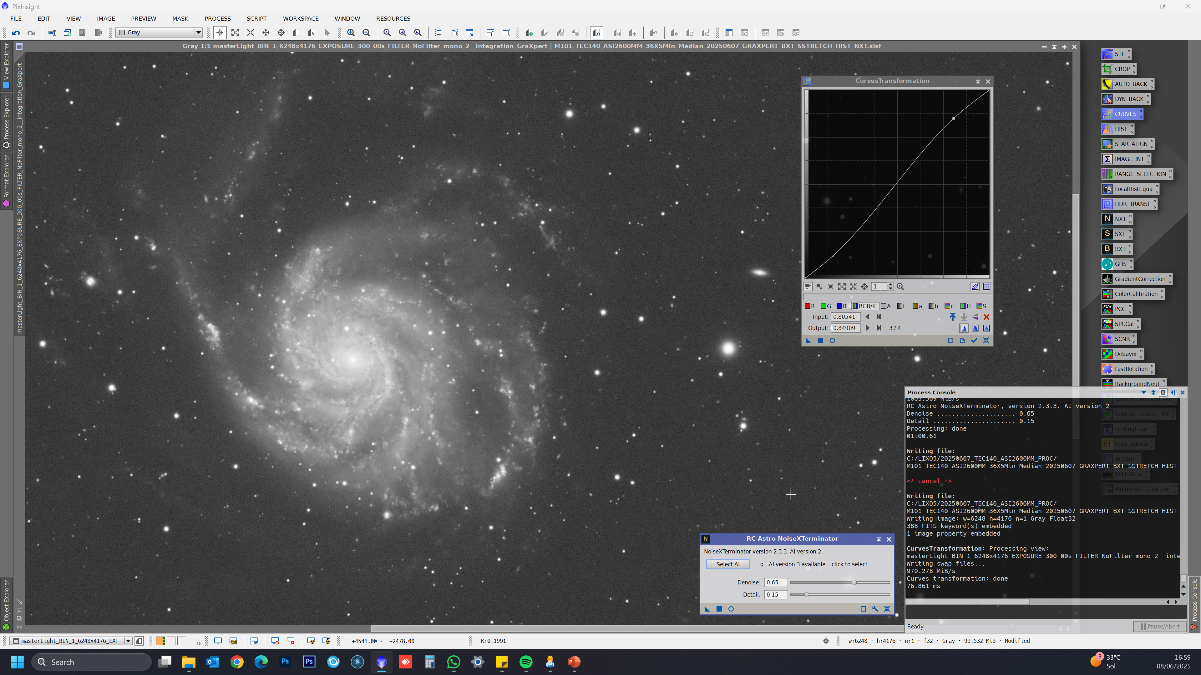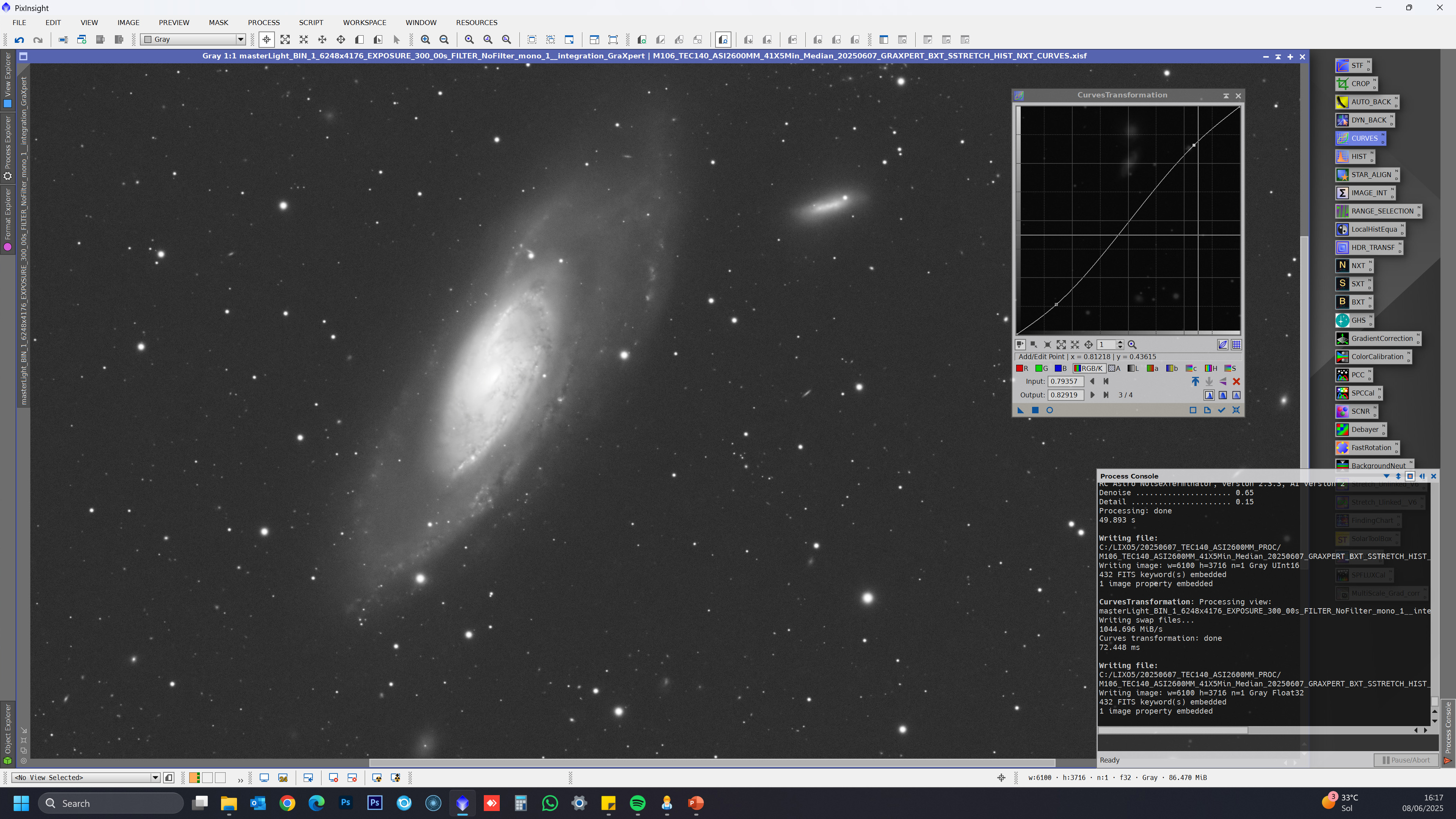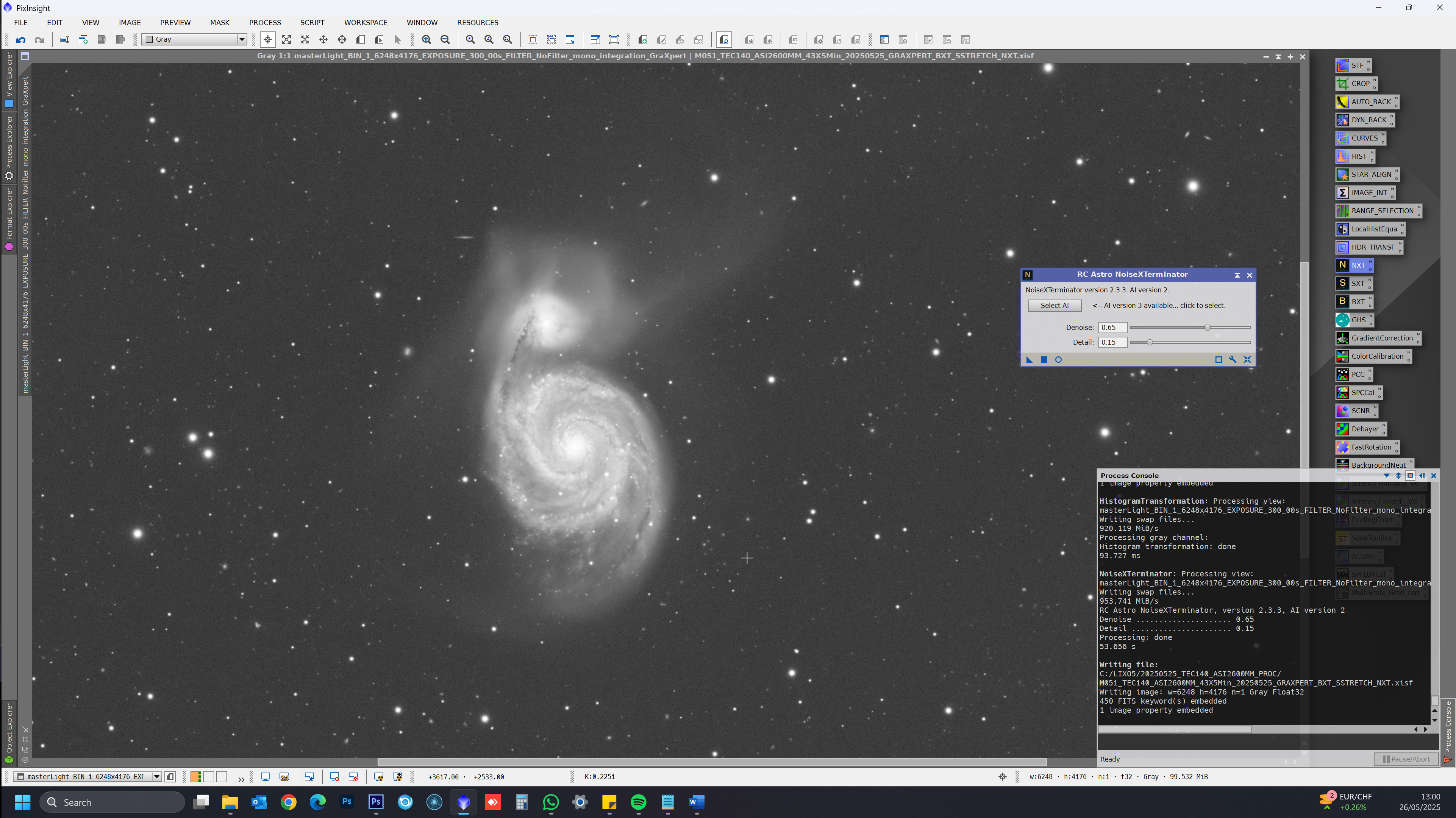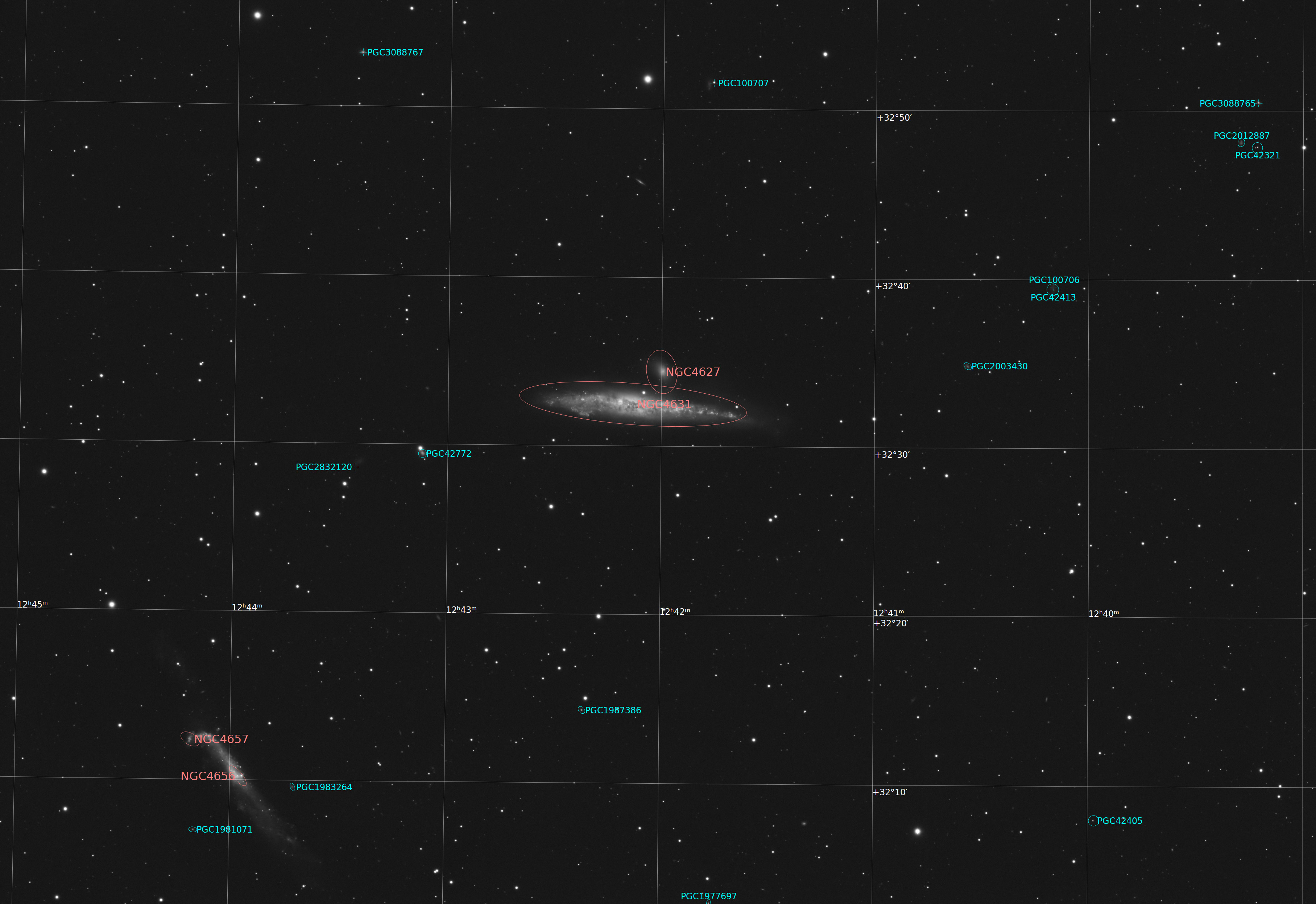 ![]() FULL SIZE FULL SIZE (ANNOTATED) FULL SIZE (NEGATIVE) FULL SIZE (ANNOTATED NEGATIVE) ABELL 2151 (Hercules Cluster). 235Min (47x5Min). TEC140 F/7, ZWO ASI2600MM, Paramount ME FULL SIZE FULL SIZE (ANNOTATED) ABELL 2151 (Hercules Cluster). 115Min (23x5Min). TEC140 F/7, ZWO ASI2600MM, Paramount ME. ![]() FULL SIZE FULL SIZE (NEGATIVE) FULL SIZE (ANNOTATED) PIXINSIGHT NGC4565. 115Min (23x5Min). TEC140 F/7, ZWO ASI2600MM, Paramount ME. ![]() FULL SIZE FULL SIZE (ANNOTATED) M106. 205Min (41x5Min). TEC140 F/7, ZWO ASI2600MM, Paramount ME FULL SIZE FULL SIZE (ANNOTATED) PIXINSIGHT PIXINSIGHT M106. 205Min (41x5Min). TEC140 F/7, ZWO ASI2600MM, Paramount ME FULL SIZE FULL SIZE (ANNOTATED) FULL SIZE (PIXINSIGHT) FULL SIZE (PIXINSIGHT) FULL SIZE (PIXINSIGHT) M106. 125Min (25x5Min). TEC140 F/7, ZWO ASI2600MM, Paramount ME. ![]() FULL SIZE FULL SIZE (ANNOTATED) M101. 180Min (36x5Min). TEC140 F/7, ZWO ASI2600MM, Paramount ME FULL SIZE FULL SIZE (ANNOTATED) PIXINSIGHT PIXINSIGHT M101. 180Min (36x5Min). TEC140 F/7, ZWO ASI2600MM, Paramount ME FULL SIZE FULL SIZE (ANNOTATED) FULL SIZE (PIXINSIGHT) FULL SIZE (PHOTOSHOP CC) M101. 115Min (23x5Min). TEC140 F/7, ZWO ASI2600MM, Paramount ME. ![]() FULL SIZE (MOSAIC) FULL SIZE (ANNOTATED) M051. 320Min (64x5Min). TEC140 F/7, ZWO ASI2600MM, Paramount ME ![]() FULL SIZE FULL SIZE FULL SIZE (ANNOTATED) FULL SIZE (ANNOTATED) FULL SIZE (PIXINSIGHT) FULL SIZE (PIXINSIGHT) FULL SIZE (PIXINSIGHT) FULL SIZE (PIXINSIGHT) FULL SIZE (PIXINSIGHT) FULL SIZE (PIXINSIGHT) FULL SIZE (PIXINSIGHT) FULL SIZE (PIXINSIGHT) FULL SIZE (PHOTOSHOP CC) M051. 320Min (64x5Min). TEC140 F/7, ZWO ASI2600MM, Paramount ME FULL SIZE FULL SIZE (ANNOTATED) FULL SIZE (PHOTOSHOP CC) FULL SIZE (PIXINSIGHT) FULL SIZE (PIXINSIGHT) FULL SIZE (PIXINSIGHT) FULL SIZE (PIXINSIGHT) M051. 215Min (43x5Min). TEC140 F/7, ZWO ASI2600MM, Paramount ME FULL SIZE FULL SIZE (ANNOTATED) FULL SIZE (PIXINSIGHT) M051. 195Min (39x5Min). TEC140 F/7, ZWO ASI2600MM, Paramount ME. 99.5% & 92% MOON FULL SIZE FULL SIZE (ANNOTATED) M051. 105Min (21x5Min). TEC140 F/7, ZWO ASI2600MM, Paramount ME. 99.5% MOON ![]() FULL SIZE FULL SIZE FULL SIZE (MOSAIC) FULL SIZE (ANNOTATED) M051. 39h. TMB175 F/8, TMB152 F/8, TEC140 F/7, STL11000, ALTA U8300, Paramount ME FULL SIZE (POSITIVE) FULL SIZE (NEGATIVE) FULL SIZE (ANNOTATED) FULL SIZE (ANNOTATED) M051. 950min (95X10Min). TMB175 F/8, STL11000, Median, Paramount ME ![]() FULL SIZE (POSITIVE) FULL SIZE (NEGATIVE) FULL SIZE (ANNOTATED) FULL SIZE (ANNOTATED) M109. 90min (9X10Min). TMB175 F/8, STL11000, Median, Paramount ME ![]() FULL SIZE (POSITIVE) FULL SIZE (NEGATIVE) FULL SIZE (ANNOTATED) FULL SIZE (ANNOTATED) Markarian's Chain. 120min (12X10Min). TMB175 F/8, STL11000, Median, Paramount ME ![]() FULL SIZE (POSITIVE) FULL SIZE (NEGATIVE) FULL SIZE (MOSAIC) FULL SIZE (ANNOTATED) FULL SIZE (ANNOTATED) NGC4631. 120min (12X10Min). TMB175 F/8, STL11000, Median, Paramount ME ![]() FULL SIZE (POSITIVE) FULL SIZE (NEGATIVE) FULL SIZE (MOSAIC) FULL SIZE (ANNOTATED) FULL SIZE (ANNOTATED) M106. 270min (27X10Min). TMB175 F/8, STL11000, Median, Paramount ME ![]() FULL SIZE (POSITIVE) FULL SIZE (NEGATIVE) FULL SIZE (MOSAIC) FULL SIZE (ANNOTATED) FULL SIZE (ANNOTATED) YOUTUBE VIDEO M051. 690min (69X10Min). TMB175 F/8, STL11000, Median, Paramount ME FULL SIZE (POSITIVE) FULL SIZE (NEGATIVE) FULL SIZE (ANNOTATED) FULL SIZE (ANNOTATED) YOUTUBE VIDEO M051. 180min (18X10Min). TMB175 F/8, STL11000, Median, Paramount ME ![]() FULL SIZE FULL SIZE (ANNOTATED) FULL SIZE (ANNOTATED) M031. 160min (16X10Min). AP130 F/6, FF, STL11000, Median, DDP, Paramount ME (MOON 63%) ![]() FULL SIZE (POSITIVE) FULL SIZE (NEGATIVE) FULL SIZE (MOSAIC) FULL SIZE (ANNOTATED) FULL SIZE (ANNOTATED) M051. 2340mim (234X10Min) (39h). TMB175 F/8 400Min, TMB152 F/8 1630Min, TEC140 F/7 310Min, STL11000, ALTA U8300, Median, DDP, Paramount ME. FULL SIZE (POSITIVE) FULL SIZE (NEGATIVE) FULL SIZE (MOSAIC) M051. 2340mim (234X10Min) (39h). TMB175 F/8 400Min, TMB152 F/8 1630Min, TEC140 F/7 310Min, STL11000, ALTA U8300, Median, DDP, Paramount ME. ![]() FULL SIZE FULL SIZE FULL SIZE (MOSAIC) FULL SIZE (ANNOTATED) M033. 5310min (531x10min) (88.5h). TMB175 F/8, TMB152 F/8, TEC140 F/7, AP130 F/6, STL11000M, ALTA U8300, Paramount ME FULL SIZE (POSITIVE) FULL SIZE (NEGATIVE) FULL SIZE (MOSAIC) M033. 5310min (531x10min) (88.5h). TMB175 F/8, TMB152 F/8, TEC140 F/7, AP130 F/6, STL11000M, ALTA U8300, Median, DDP, Paramount ME. ![]() FULL SIZE FULL SIZE FULL SIZE (MOSAIC) FULL SIZE (ANNOTATED) M101. 68h. TMB175 F/8, TMB 152mm F/8, TEC140 F/7, SBIG STL11000, APOGEE ALTAU8300, Paramount ME FULL SIZE (POSITIVE) FULL SIZE (NEGATIVE) FULL SIZE (MOSAIC) M101. 3020min (302X10Min) (50.3h). TMB 152mm F/8, STL11002M (241x10min), TEC140 F/7, APOGEE ALTAU8300 (62X10Min), Median, DDP, Paramount ME. ![]() FULL SIZE (BlurXterminator) FULL SIZE (BlurXterminator) FULL SIZE (AstroSharp - First Beta) FULL SIZE (Newest Model) M101. 3020min (302X10Min). TMB 152mm F/8, STL11002M (241x10min), TEC140 F/7, APOGEE ALTAU8300 (62X10Min), Median, DDP, Paramount ME, processed with PixInsight ![]() FULL SIZE (POSITIVE) FULL SIZE (NEGATIVE) FULL SIZE (MOSAIC) FULL SIZE (ANNOTATED) FULL SIZE (ANNOTATED) NGC4565. 690min (69x10min). TMB152 F/8, 45X10Min, MB175 F/8, 24x10Min, STL11000M, Median, DDP, Paramount ME. FULL SIZE (POSITIVE) FULL SIZE (NEGATIVE) FULL SIZE (ANNOTATED) FULL SIZE (ANNOTATED) YOUTUBE VIDEO NGC4565. 240min (24x10min). TMB175 F/8, STL11000M, Median, DDP, Paramount ME. ![]() FULL SIZE (POSITIVE) FULL SIZE (NEGATIVE) FULL SIZE (MOSAIC) ANNOTATED IMAGE (POSITIVE) ANNOTATED IMAGE (NEGATIVE) M081/82. 340min (34x10min). TMB175 F/8, STL11000M, Median, DDP, Paramount ME. FULL SIZE (POSITIVE) FULL SIZE (NEGATIVE) FULL SIZE (MOSAIC) YOUTUBE VIDEO M081/82. 180min (18x10min). TMB175 F/8, STL11000M, Median, DDP, Paramount ME. ![]() FULL SIZE (POSITIVE) FULL SIZE (NEGATIVE) FULL SIZE (MOSAIC) YOUTUBE VIDEO M051. 2340mim (39h). TMB175 F/8 400Min, TMB152 F/8 1630Min, TEC140 F/7 310Min, STL11000