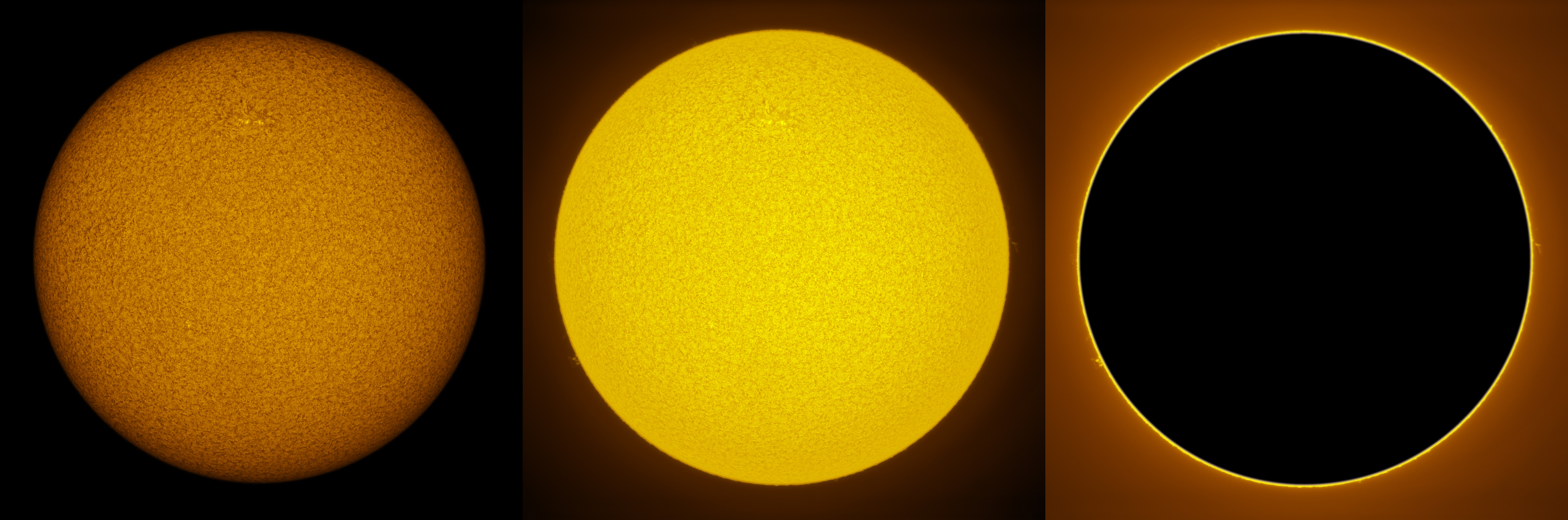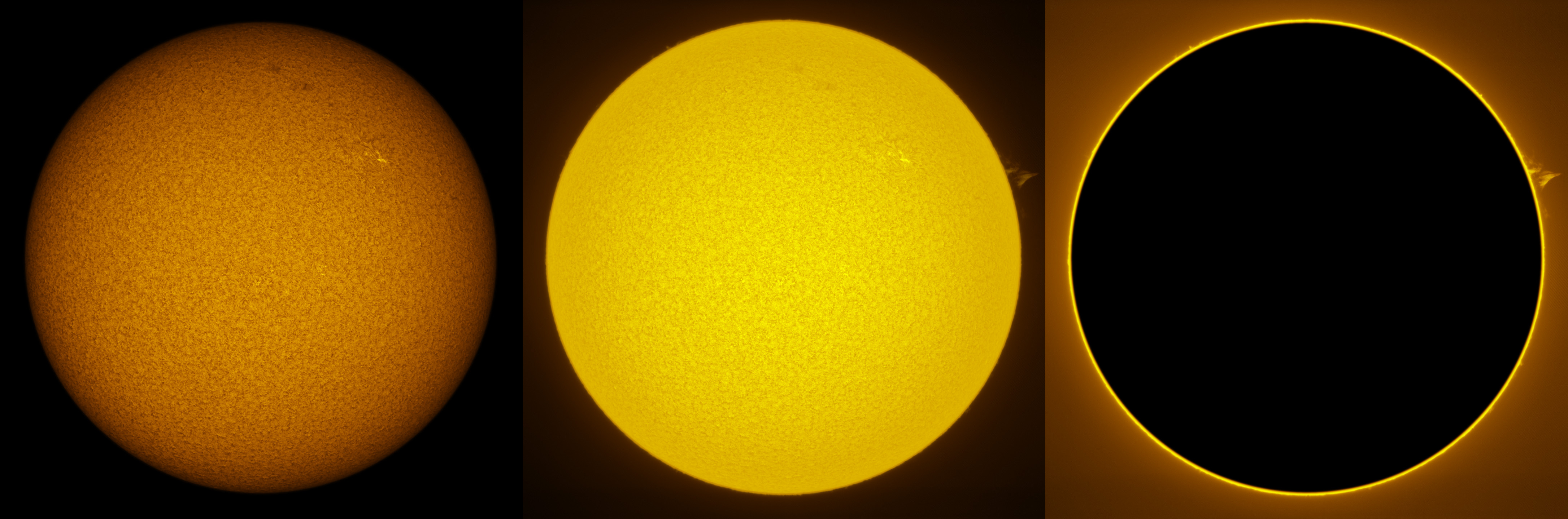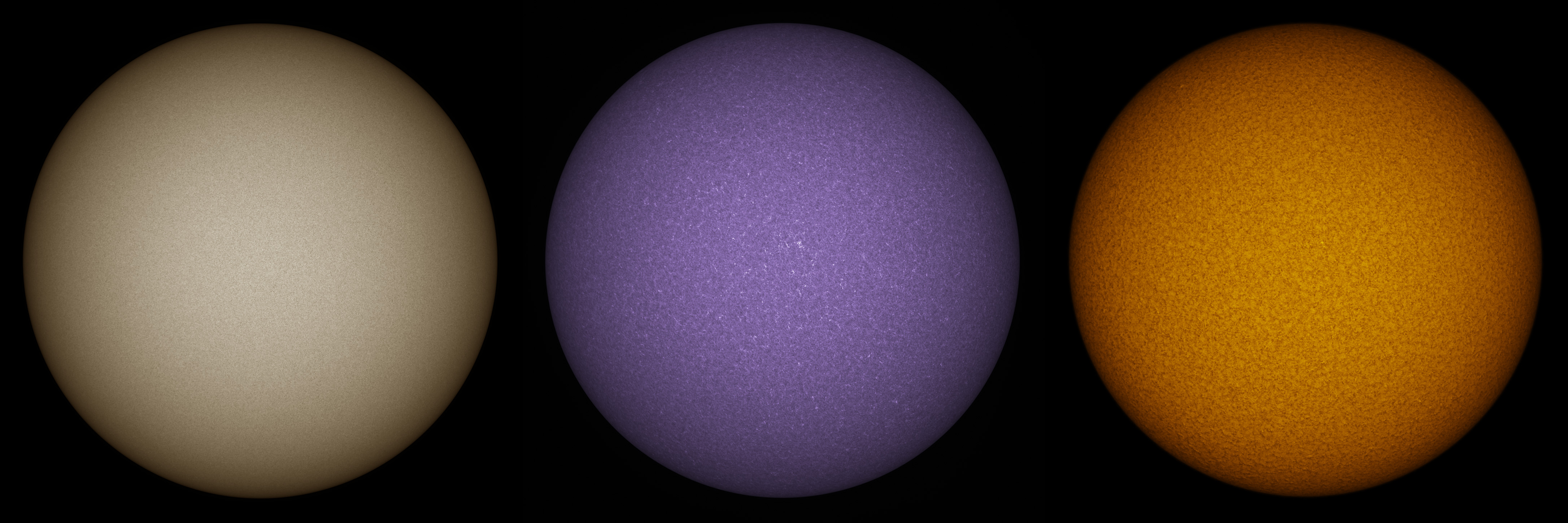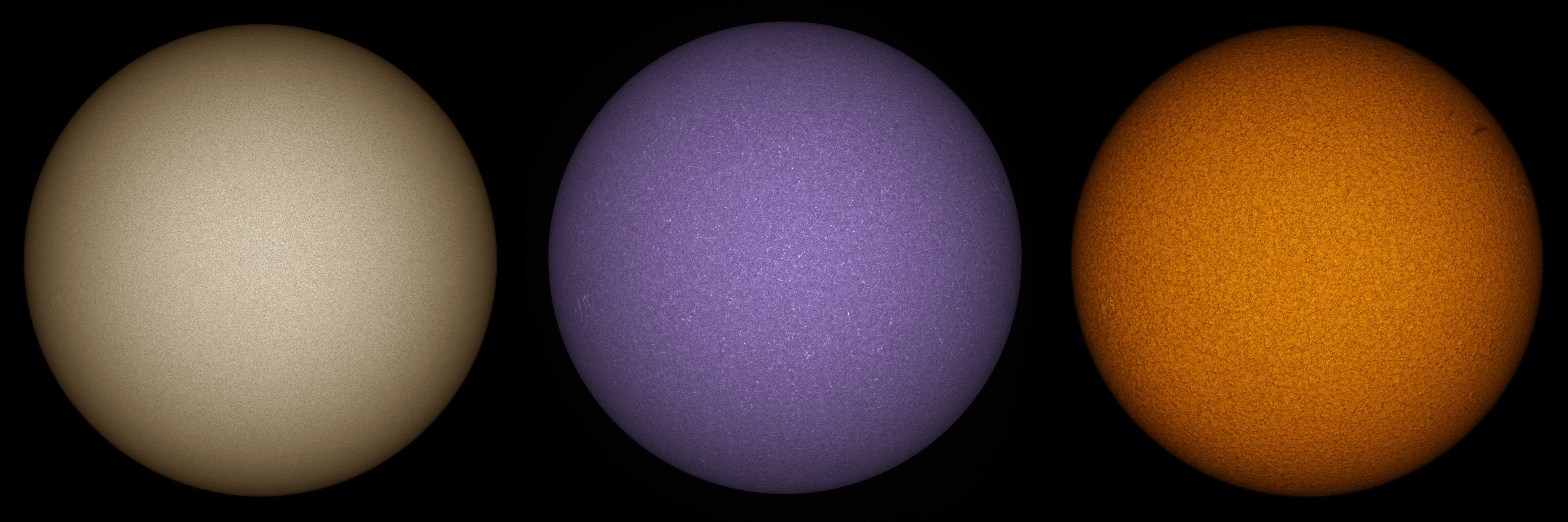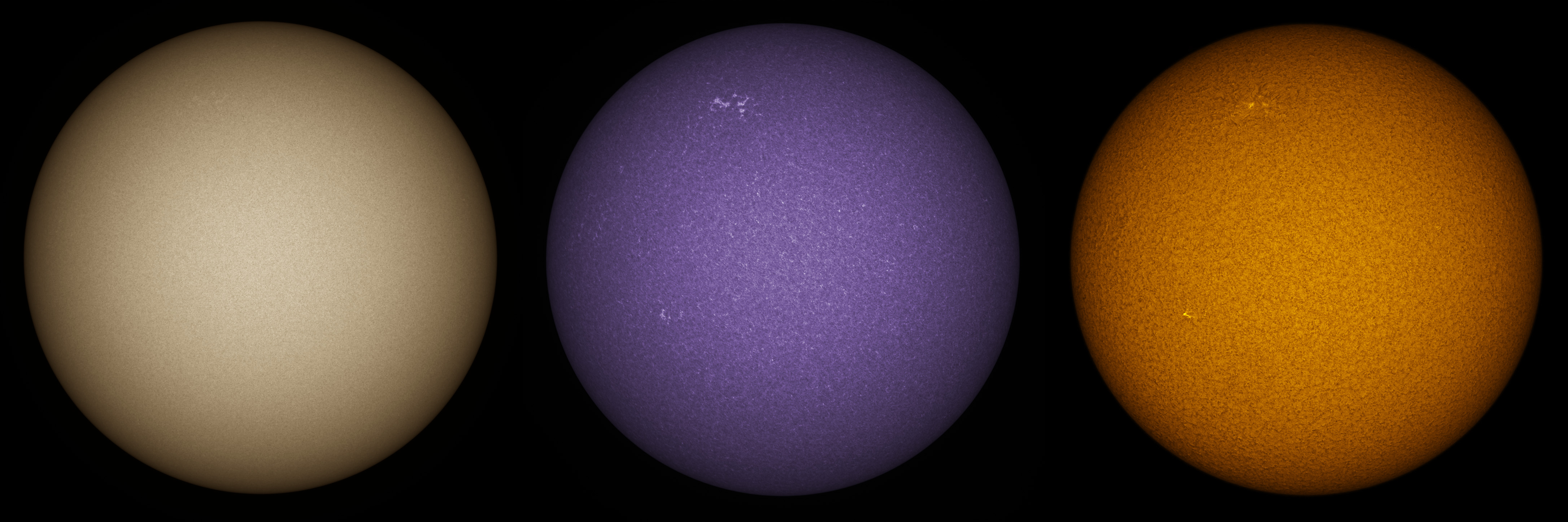 SUN (20200520) WL, CaK & H-alpha (08:30 UTC). TV101 F/5.4, LUNT 1200 CaK Module, SM60, BF30, PGR GRASSHOPPER 3 GS3-U3-28S4M