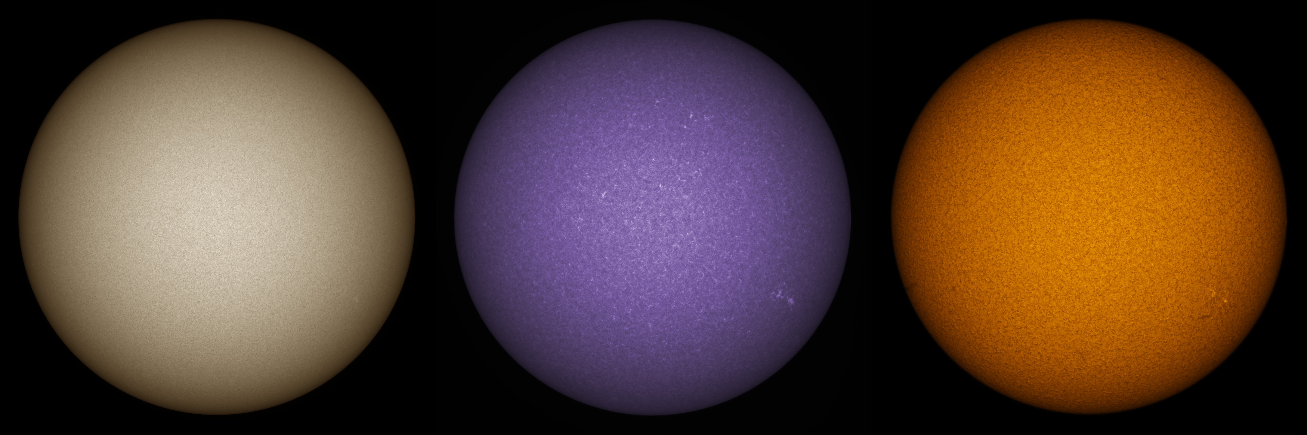 SUN (20200510) WL, CaK & H-alpha (08:30 UTC). TV101 F/5.4, LUNT 1200 CaK Module, SM60, BF30, PGR GRASSHOPPER 3 GS3-U3-28S4M