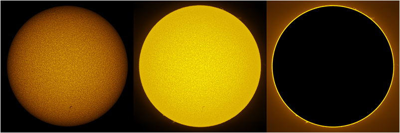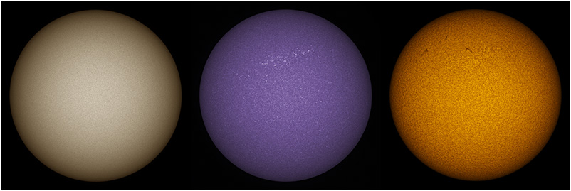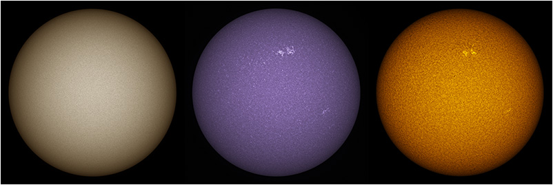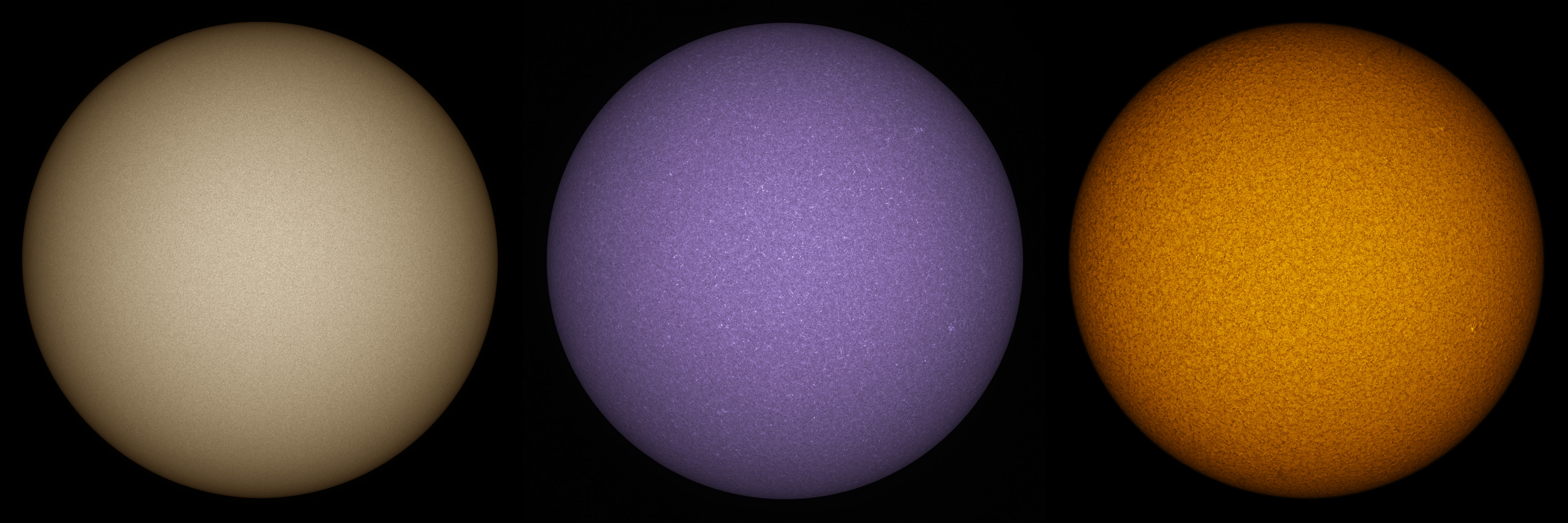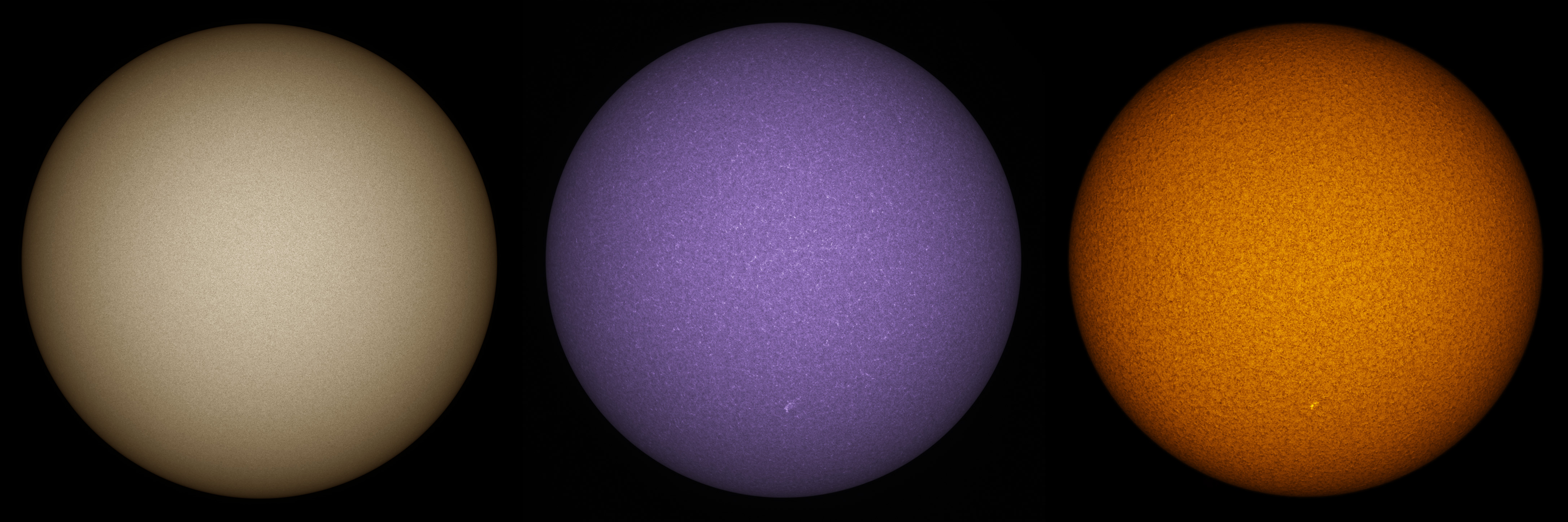 SUN (20200903) WL, CaK & H-alpha (08:00 UTC). TV101 F/5.4, LUNT 1200 CaK Module, SM60, BF30, PGR GRASSHOPPER 3 GS3-U3-28S4