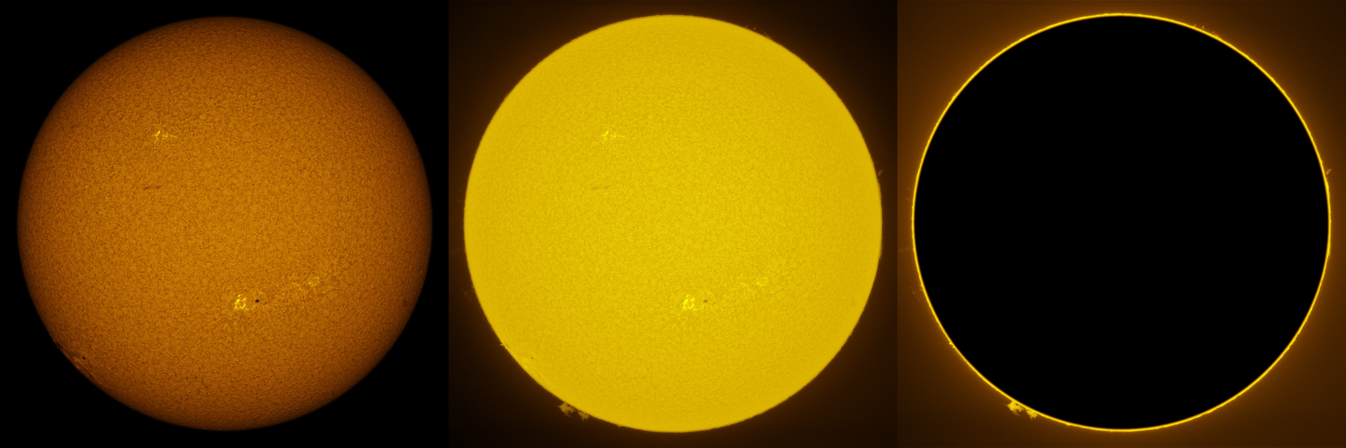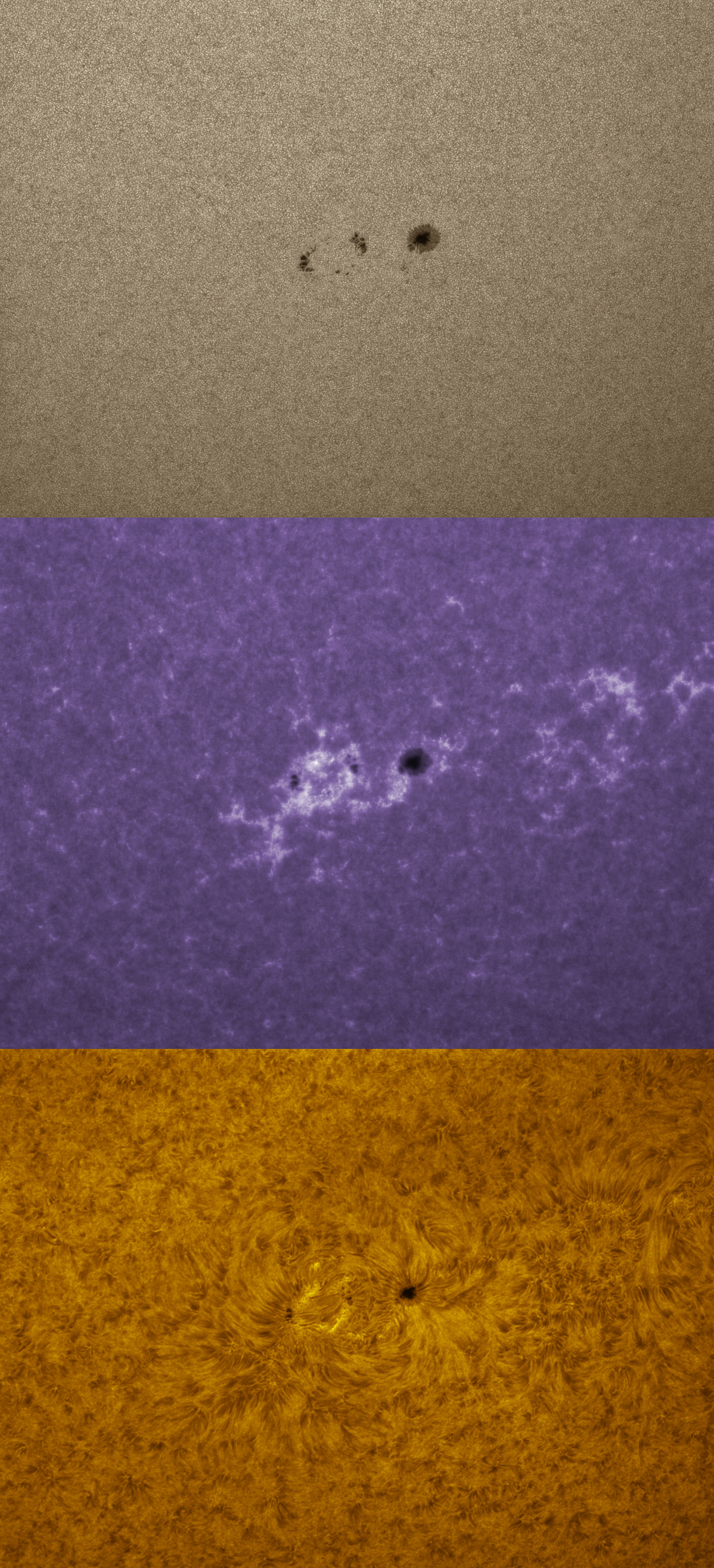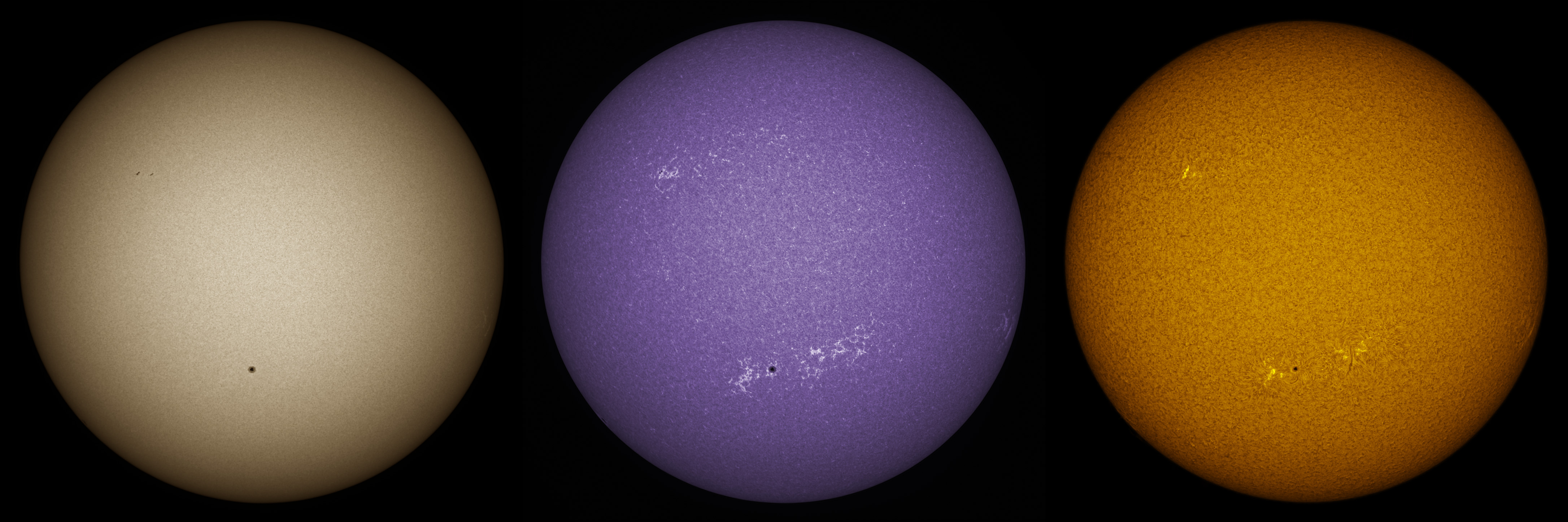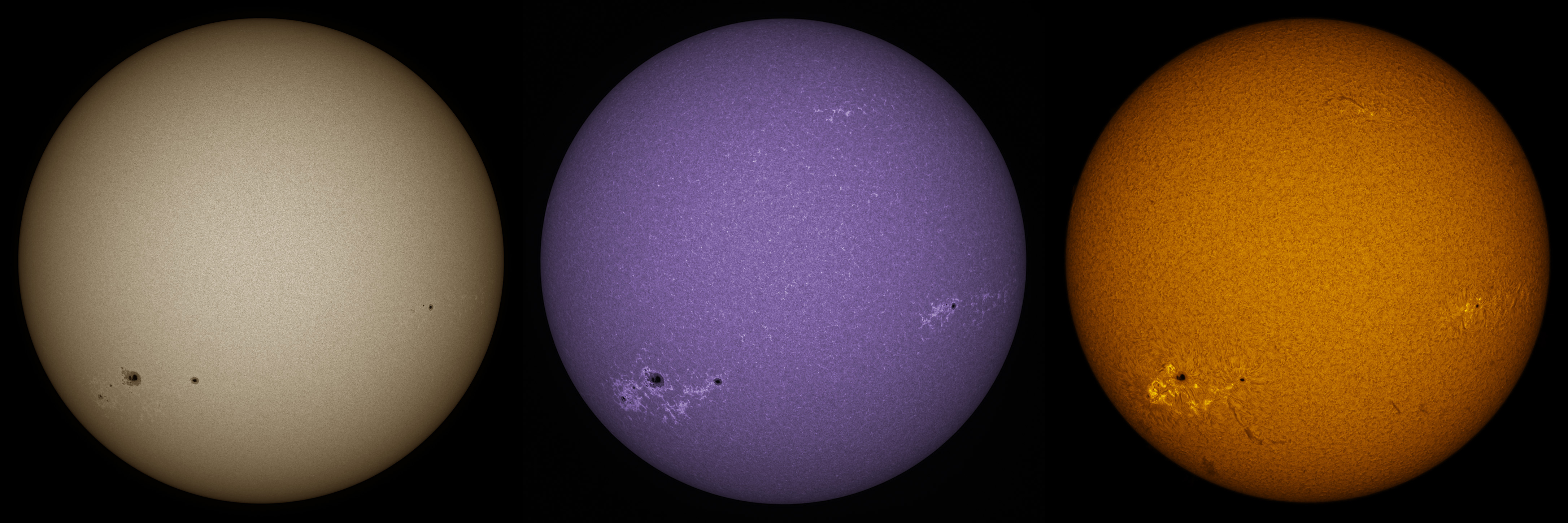 SUN (20201123) WL, CaK & H-alpha. LUNT152 F/6, LUNT152 CaK Module, B3400, X2 Barlow (@X1.4) PGR GRASSHOPPER 3 GS3-U3-28S4M