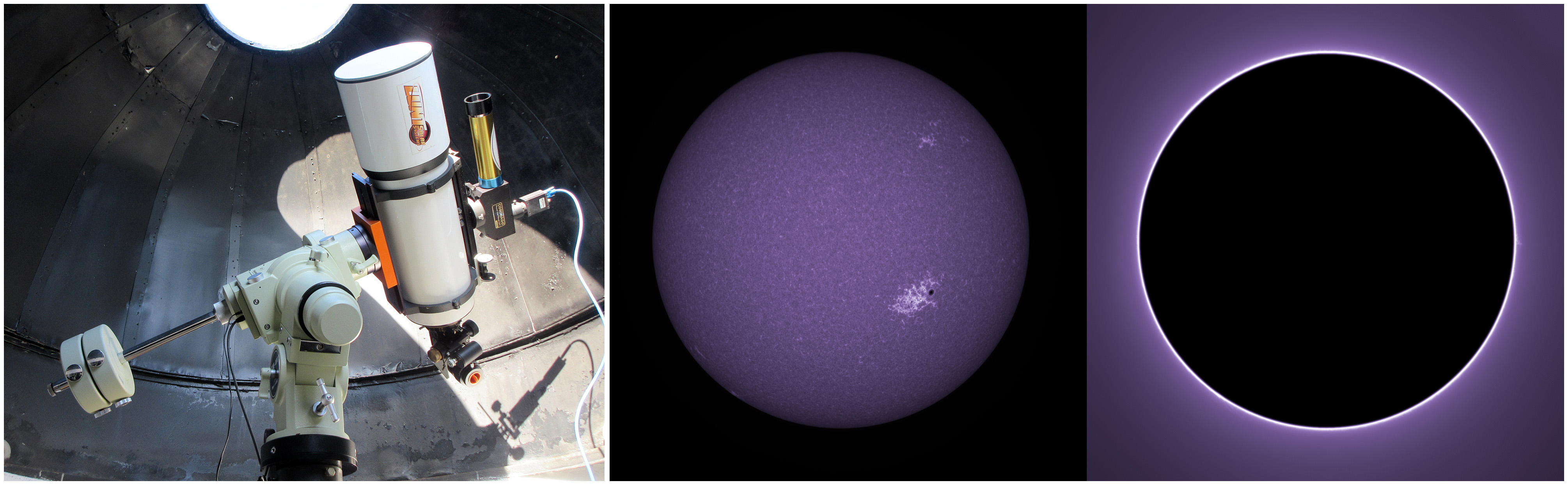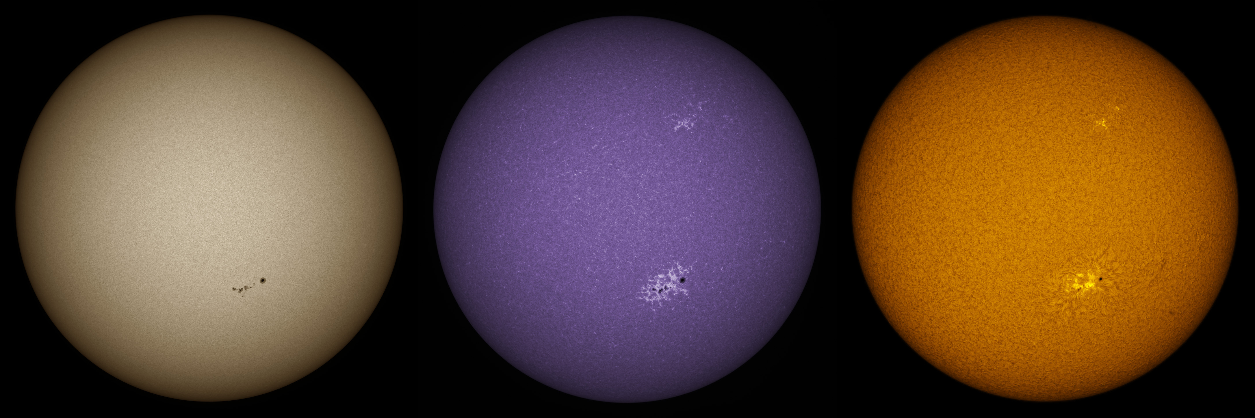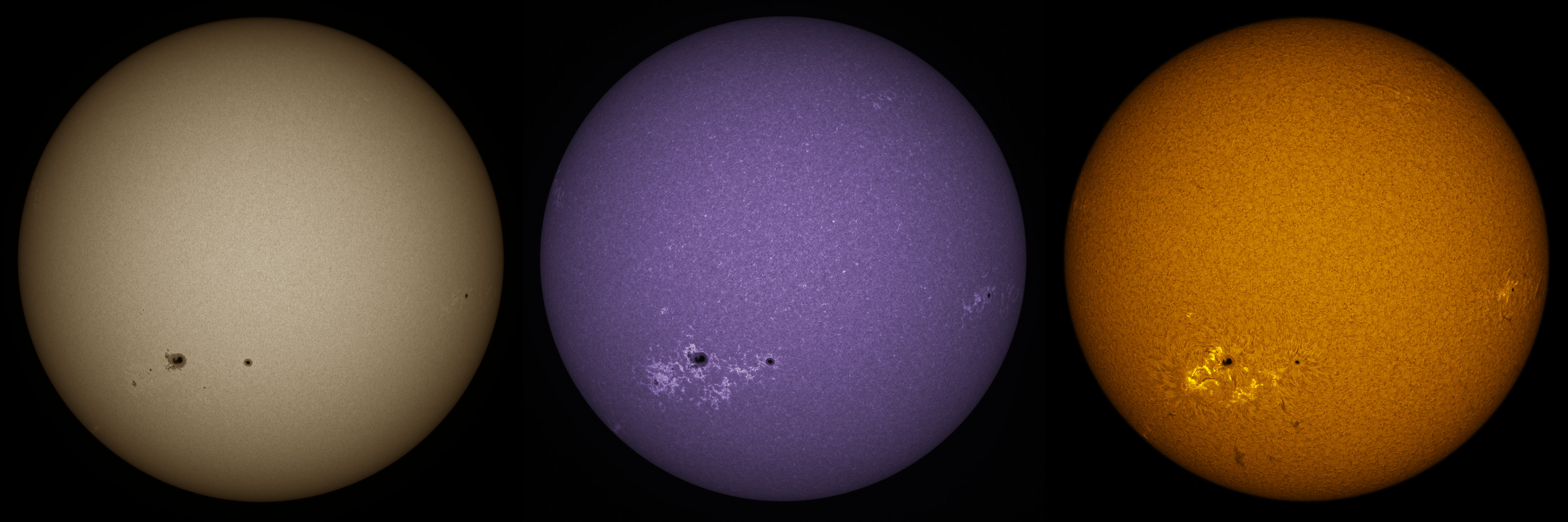 SUN (20201110) WL, CaK & H-alpha (14:00 UTC). TV101 F/5.4, LUNT 1200 CaK Module, SM60, BF30, PGR GRASSHOPPER 3 GS3-U3-28S4