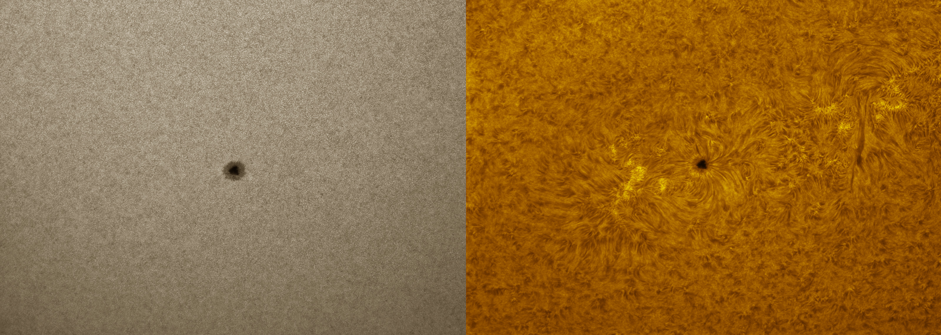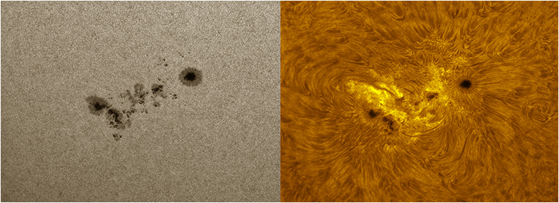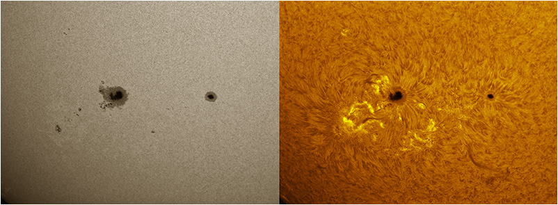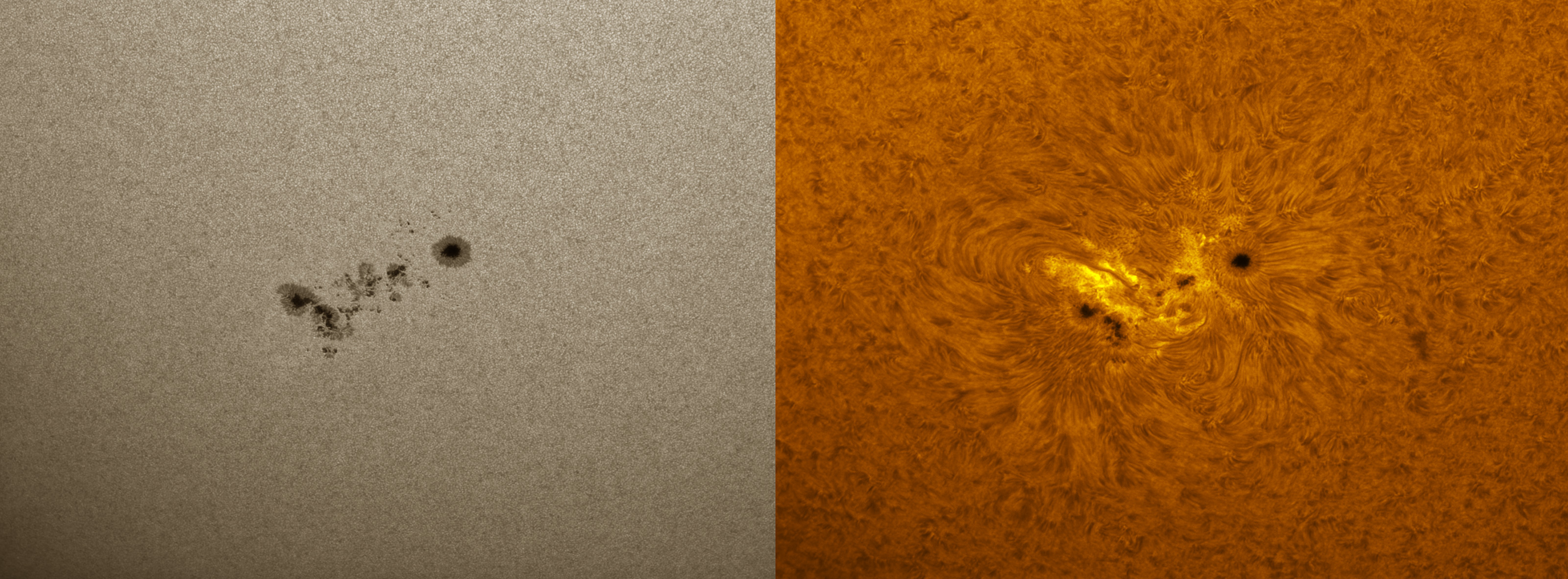 SUN (20201107) WL & H-alpha. LUNT152 F/6, B3400, X4 Powermate, PGR GRASSHOPPER 3 GS3-U3-28S4, processed with IMPPG