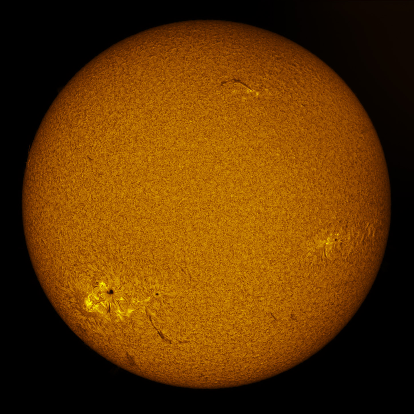 SUN (20201123) WL, CaK & H-alpha (09:00 UTC). TV101 F/5.4, LUNT 1200 CaK Module, SM60, BF30, PGR GRASSHOPPER 3 GS3-U3-28S4