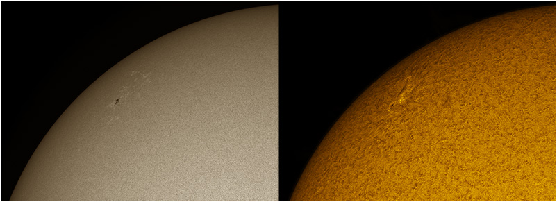SUN (20210323) WL & H-alpha. LUNT152 F/6, B3400, X2 Barlow (@X1.4), PGR GRASSHOPPER 3 GS3-U3-28S4M
