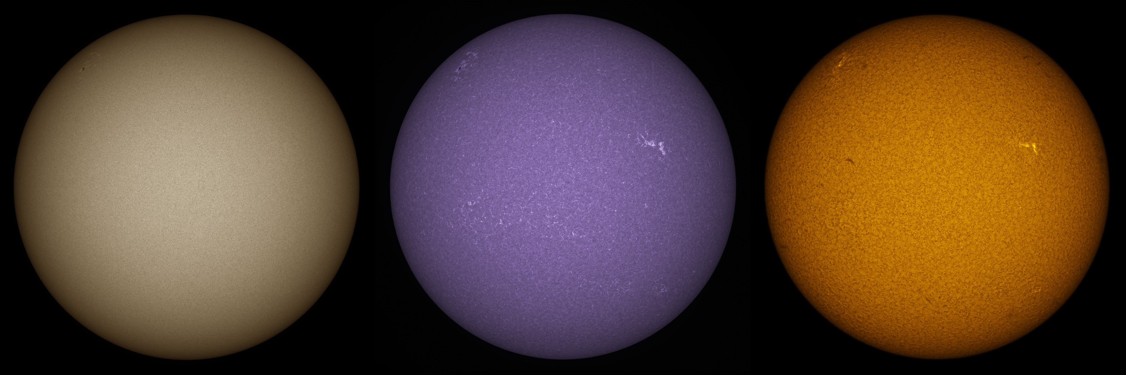 SUN (20210303) WL, CaK & H-alpha (10:00 UTC). TV101 F/5.4, LUNT 1200 CaK Module, SM60, BF30, PGR GRASSHOPPER 3 GS3-U3-28S4
