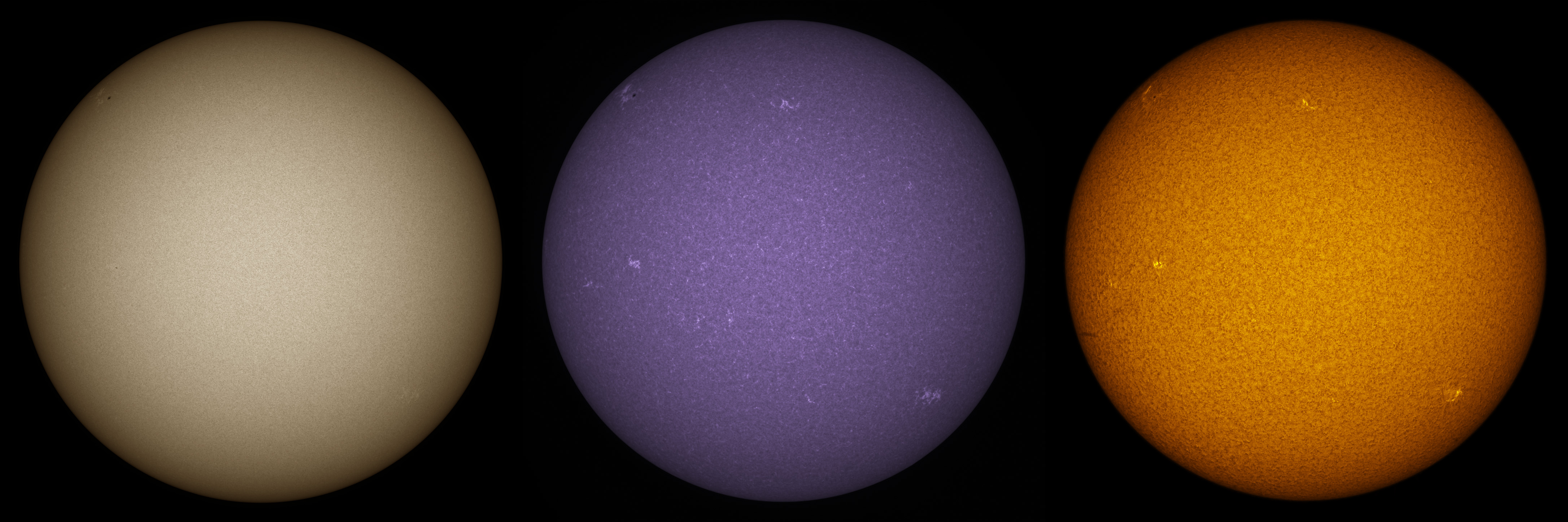 SUN (20210308) WL, CaK & H-alpha (09:30 UTC). TV101 F/5.4, LUNT 1200 CaK Module, SM60, BF30, PGR GRASSHOPPER 3 GS3-U3-28S4