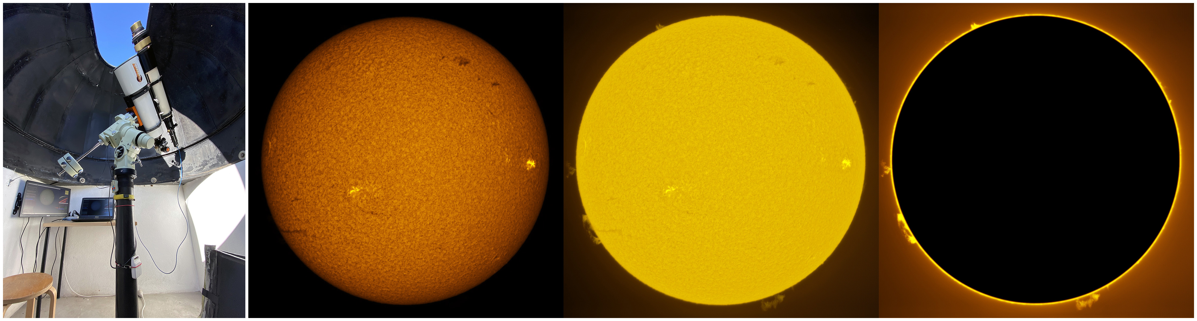 SUN (20210402) WL, CaK & H-alpha (09:00 UTC). TV101 F/5.4, LUNT 1200 CaK Module, SM60, BF30, PGR GRASSHOPPER 3 GS3-U3-28S4