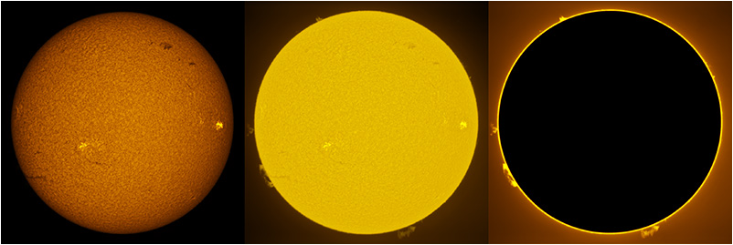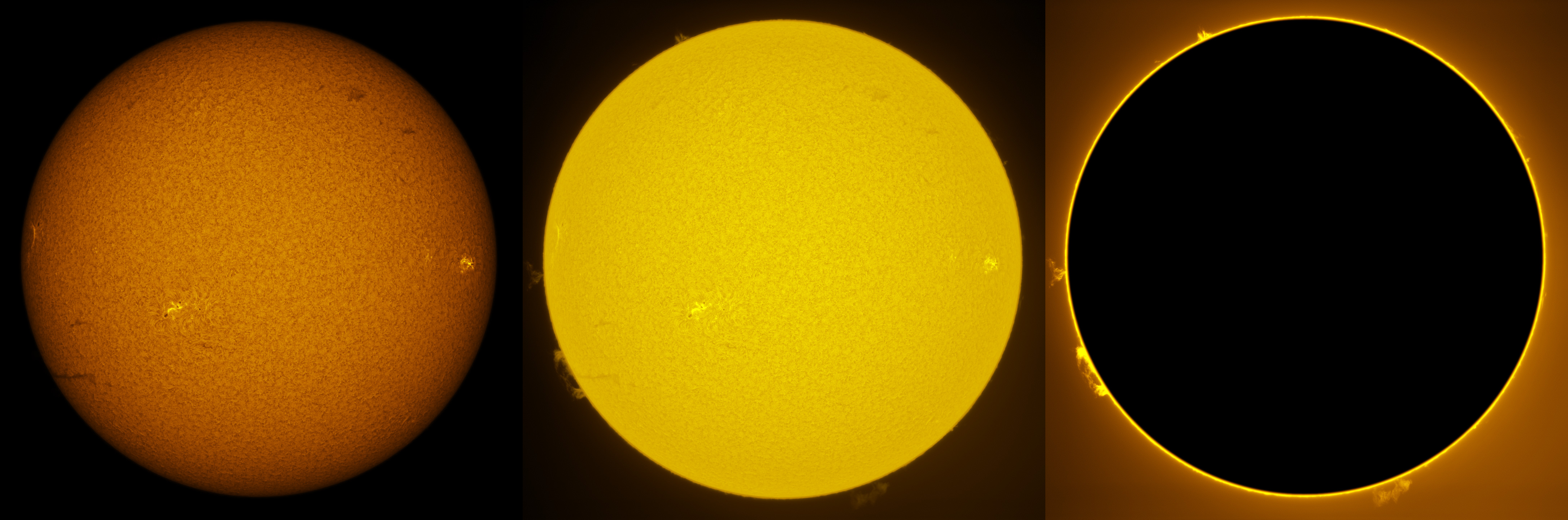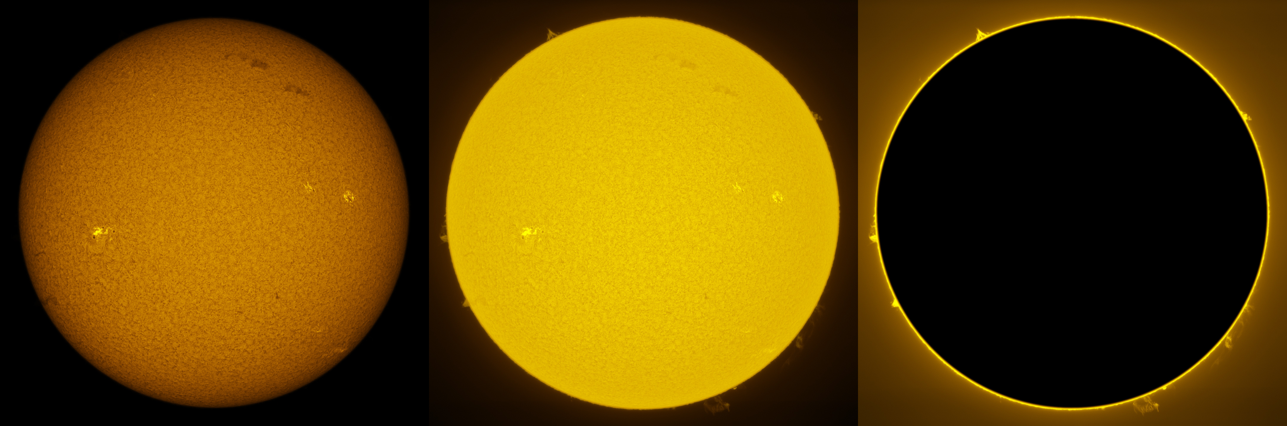 SUN (20210416) WL, CaK & H-alpha (09:00 UTC). TV101 F/5.4, LUNT 1200 CaK Module, SM60, BF30, PGR GRASSHOPPER 3 GS3-U3-28S4