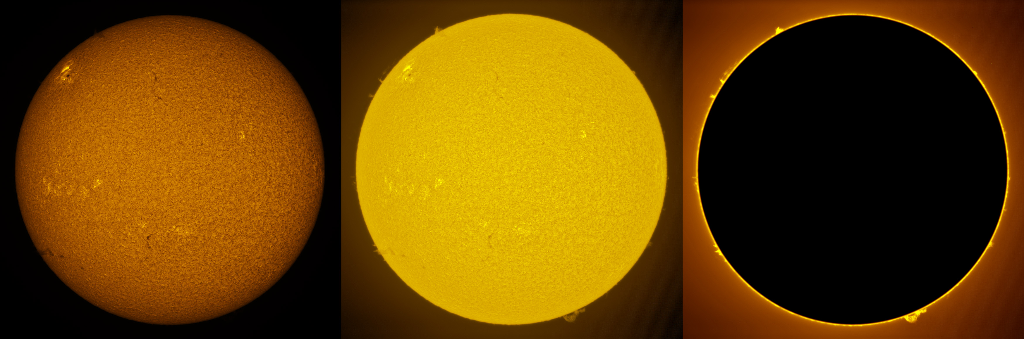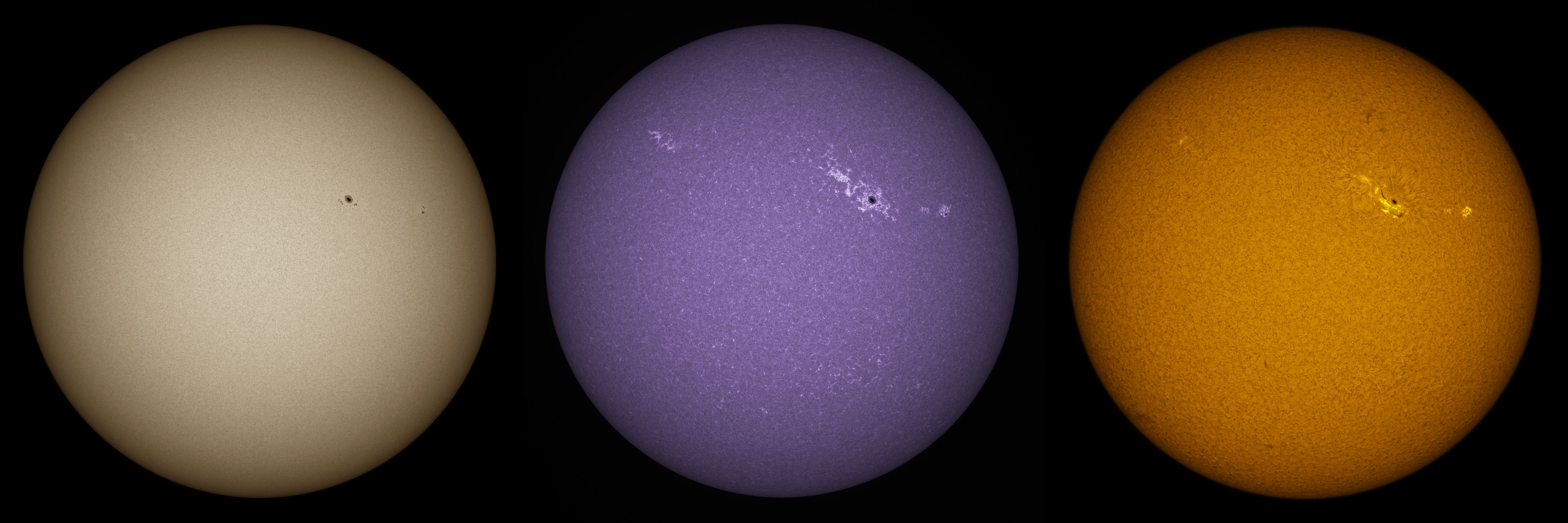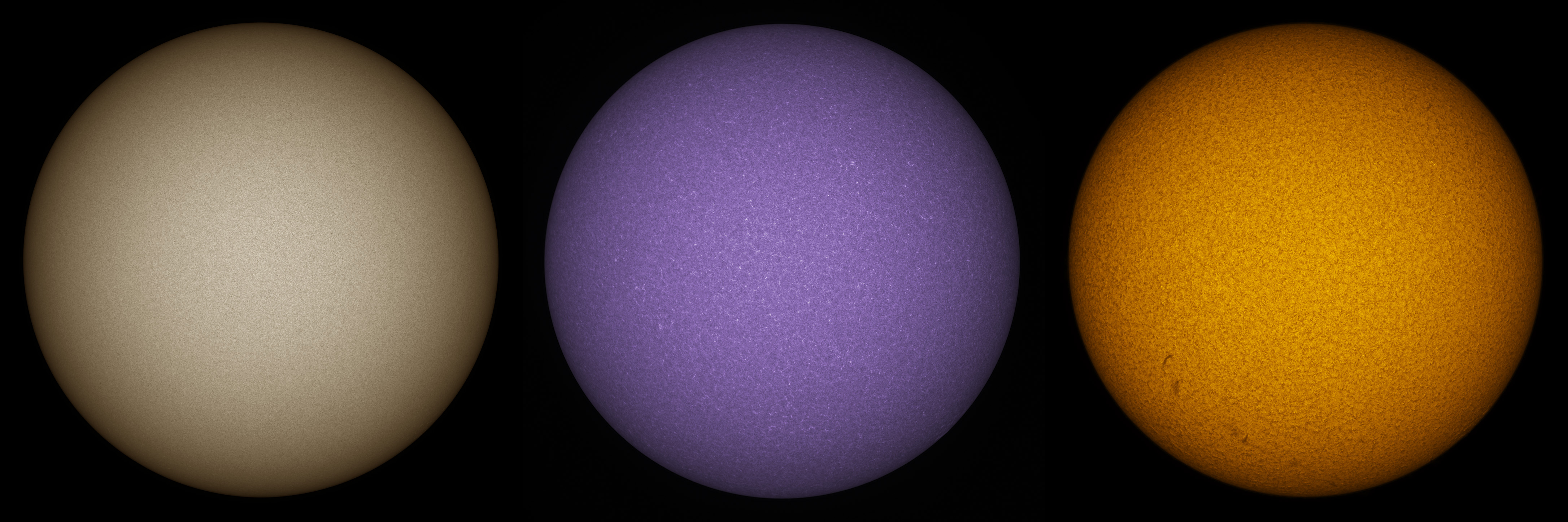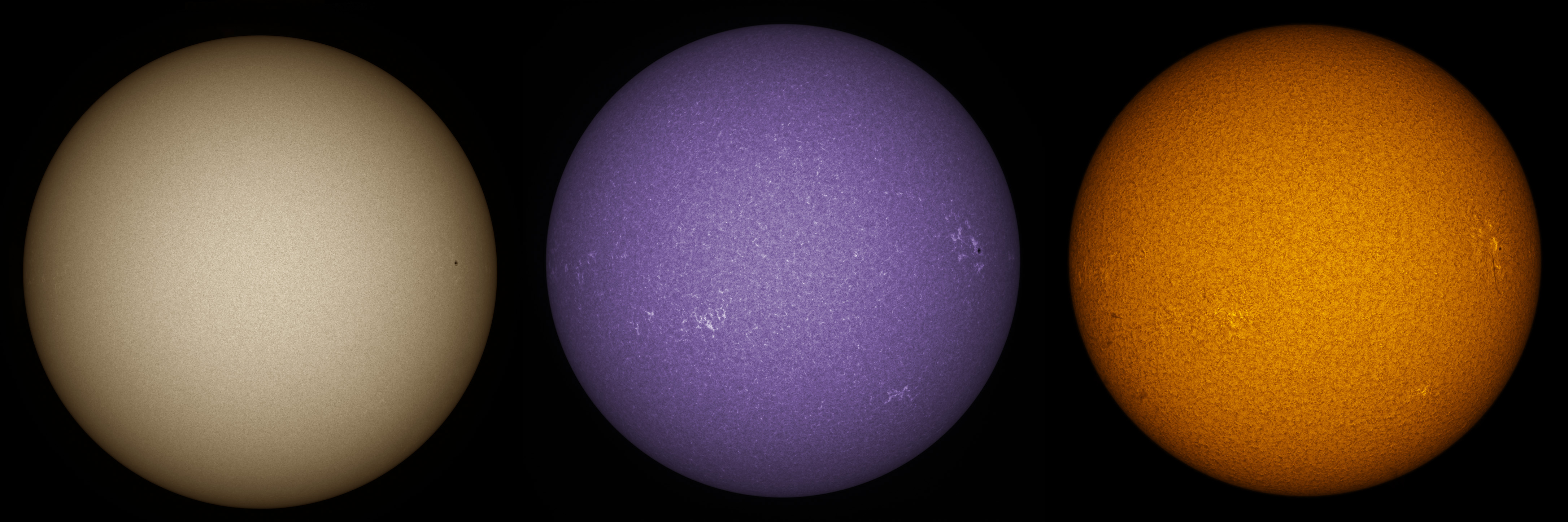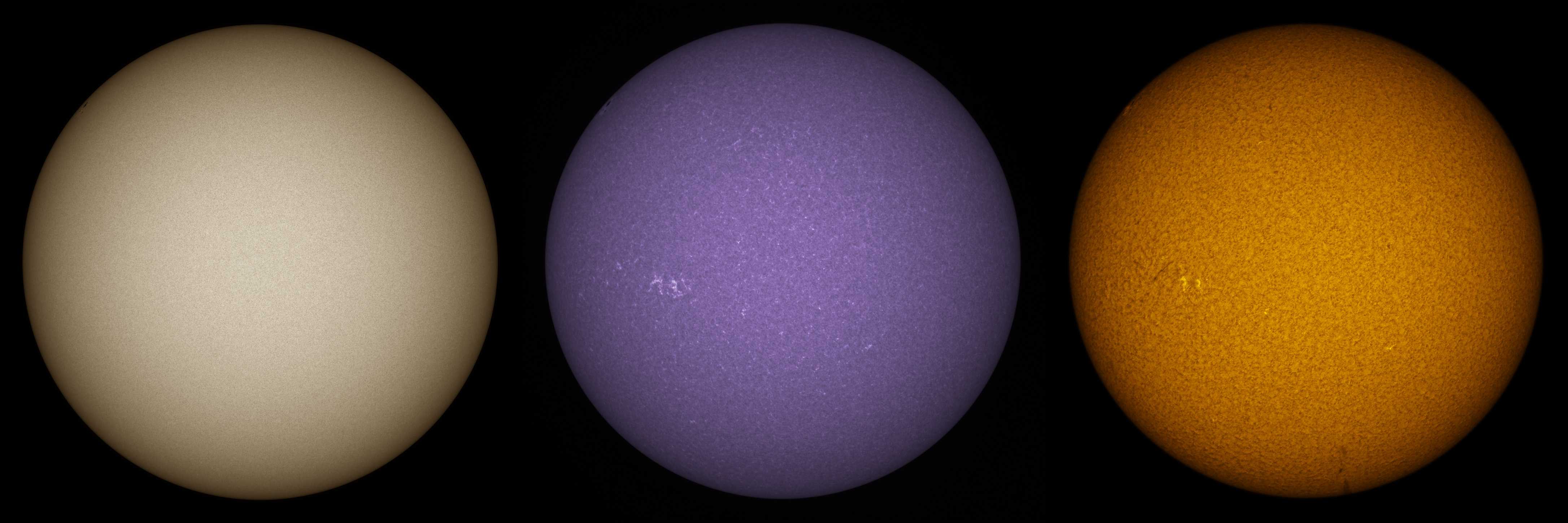 SUN (20210514) WL, CaK & H-alpha (08:30 UTC). TV101 F/5.4, LUNT 1200 CaK Module, SM60, BF30, PGR GRASSHOPPER 3 GS3-U3-28S4