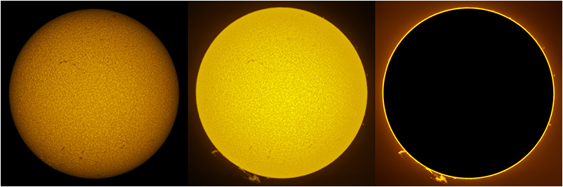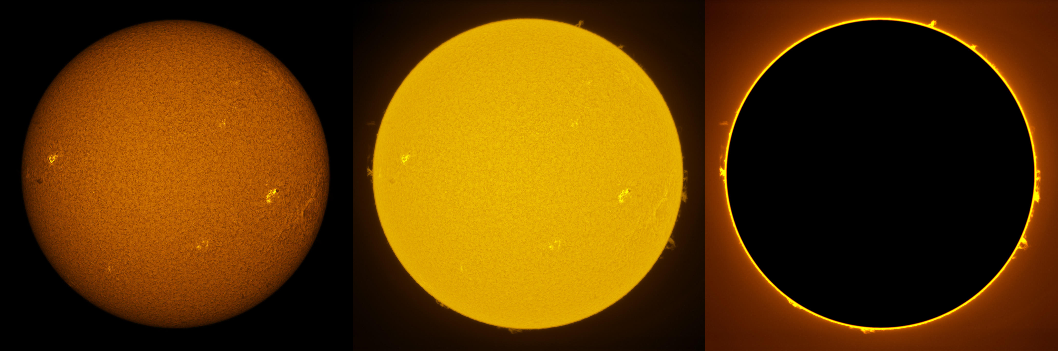 SUN (20210917) WL, CaK & H-alpha (08:00 UTC). TV101 F/5.4, LUNT 1200 CaK Module, SM60, BF30, PGR GRASSHOPPER 3 GS3-U3-28S4