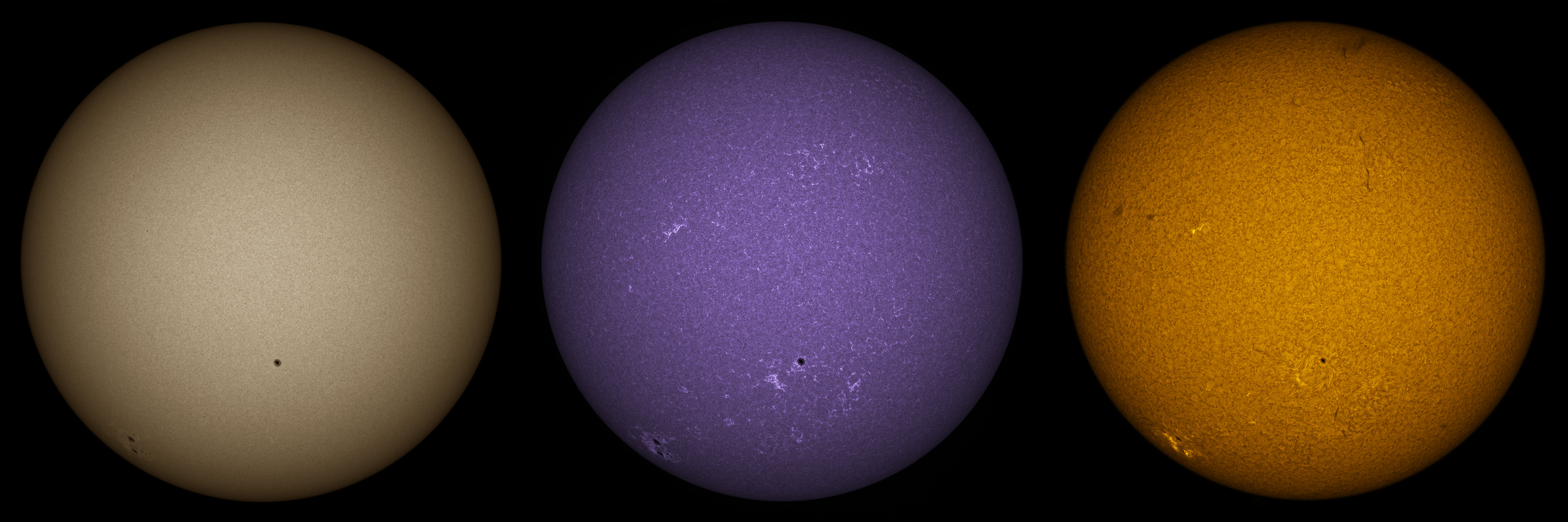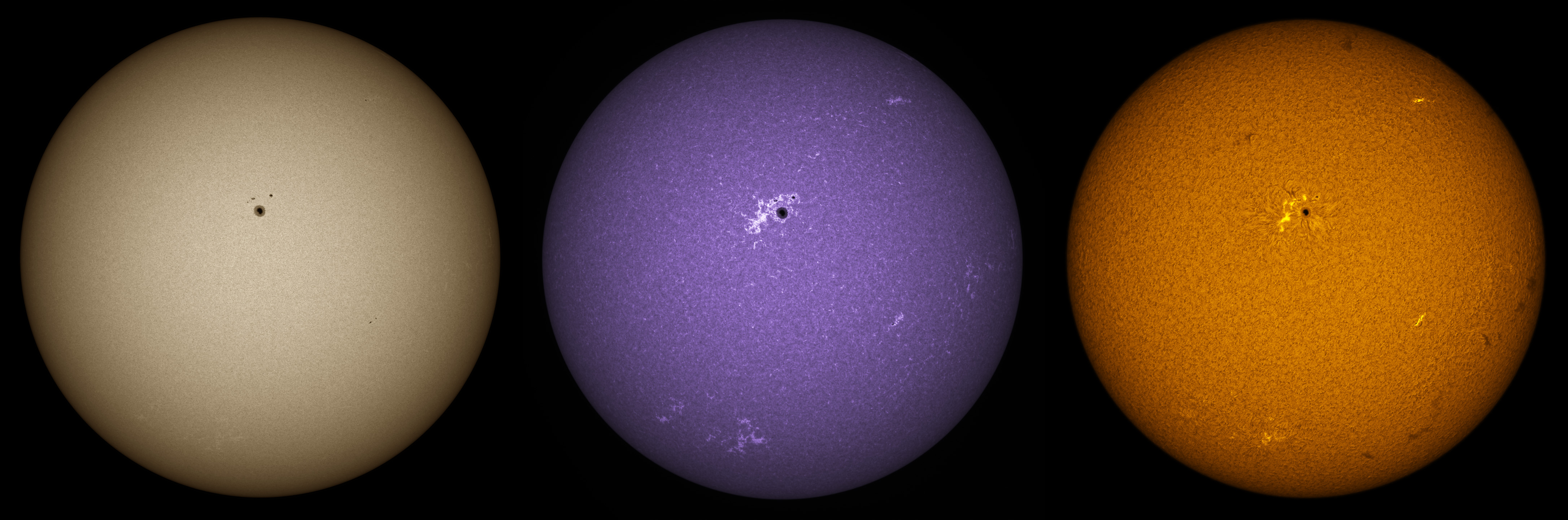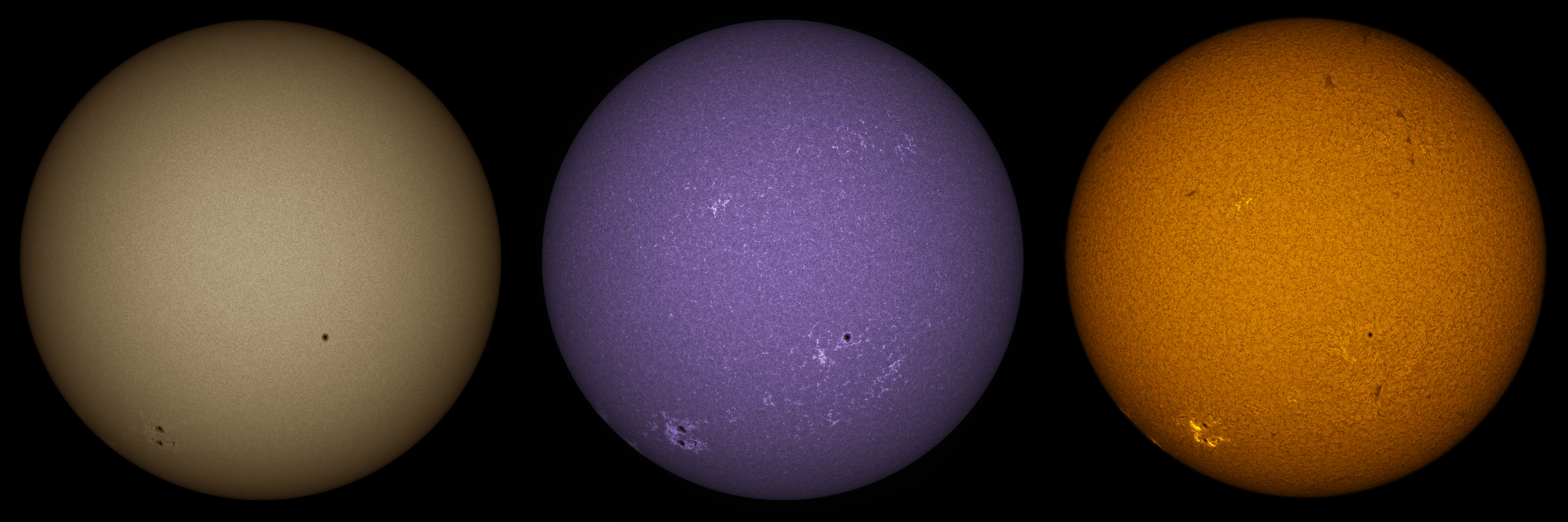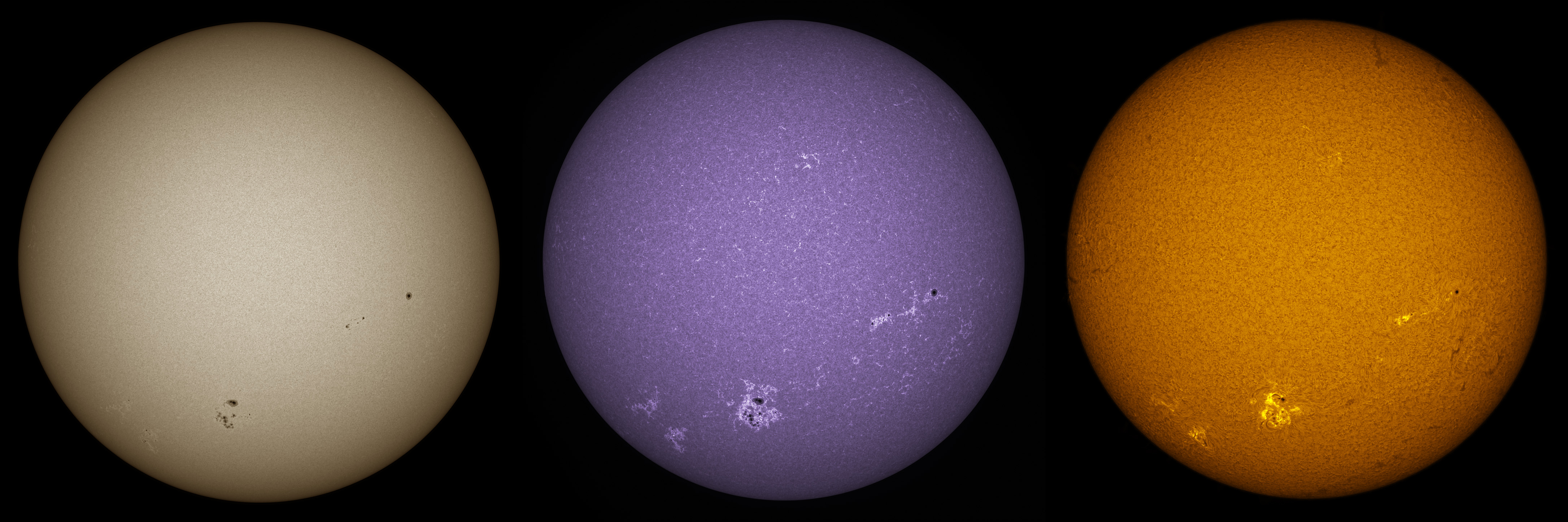 SUN (20211025) WL, CaK & H-alpha. LUNT152 F/6, LUNT152 CaK Module, B3400, X2 Barlow (@X1.4), PGR GRASSHOPPER 3 GS3-U3-28S4M