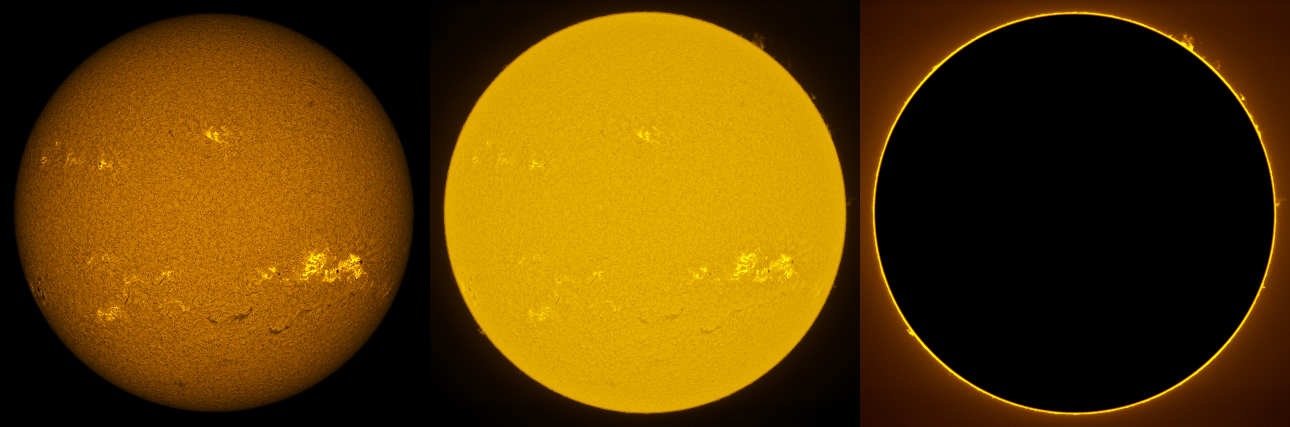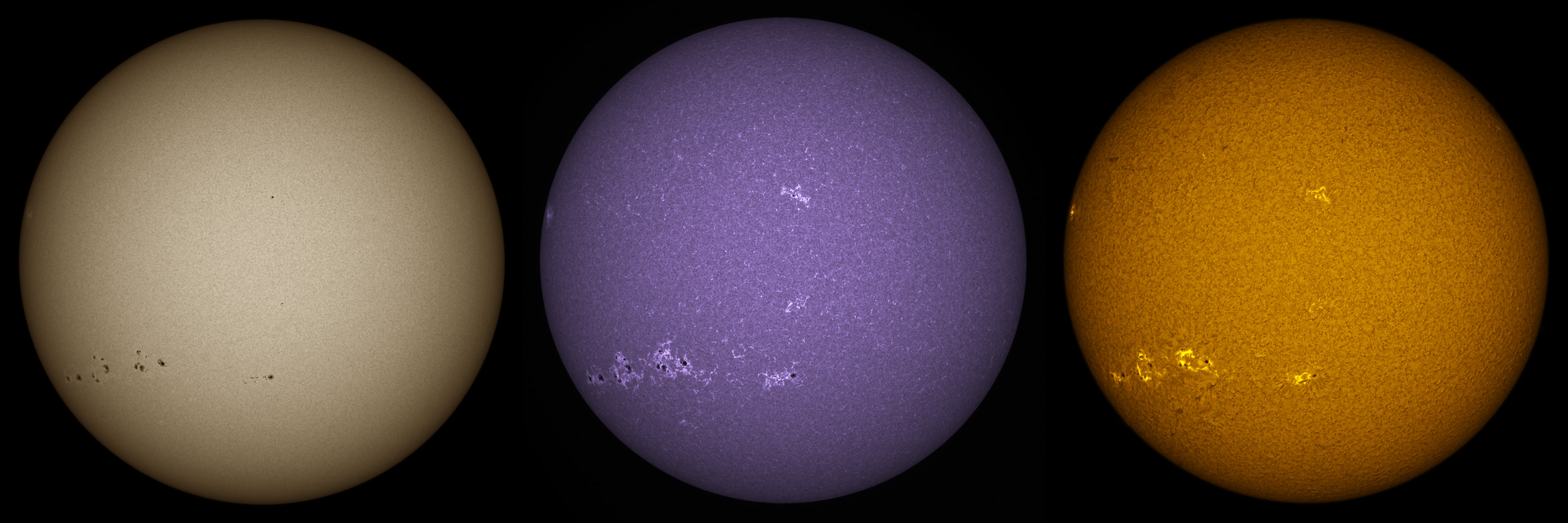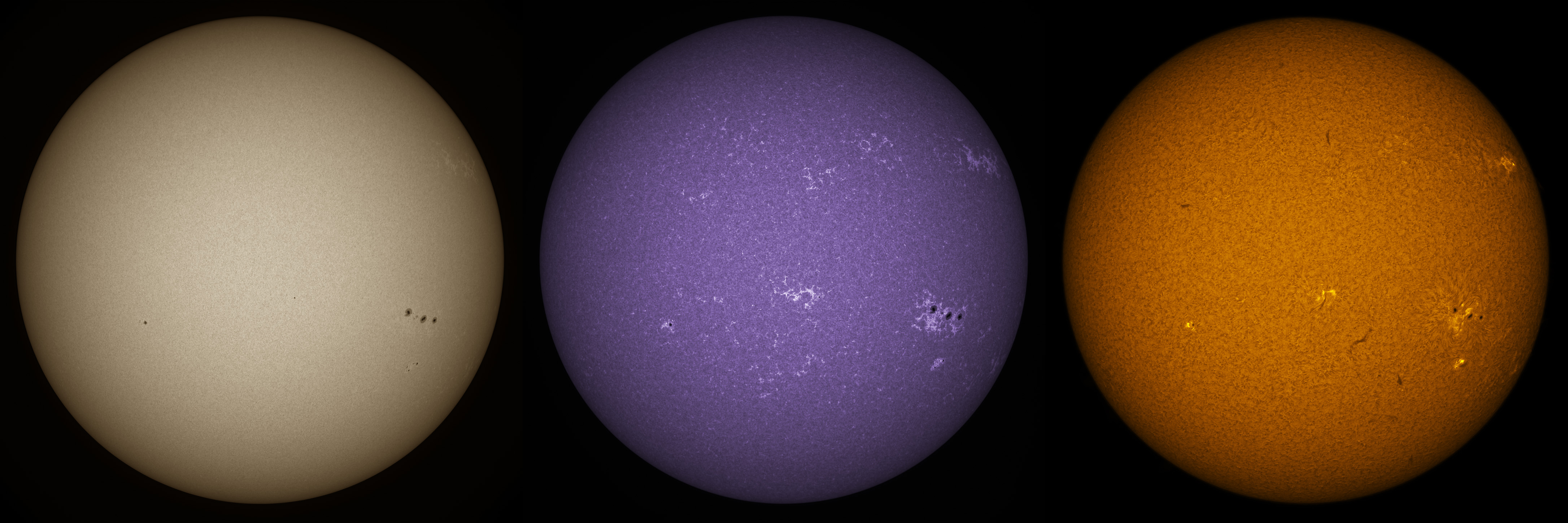 SUN (20211216) WL, CaK & H-alpha (09:30 UTC). TV101 F/5.4, LUNT 1200 CaK Module, SM60, BF30, PGR GRASSHOPPER 3 GS3-U3-28S4M