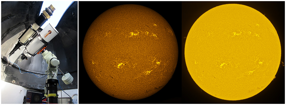 SUN (20211230) WL, CaK & H-alpha (14:30 UTC). TV101 F/5.4, LUNT 1200 CaK Module, SM60, BF30, PGR GRASSHOPPER 3 GS3-U3-28S4M