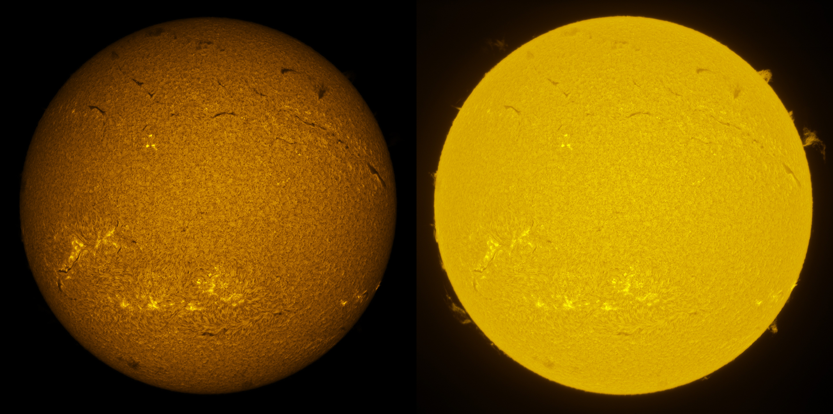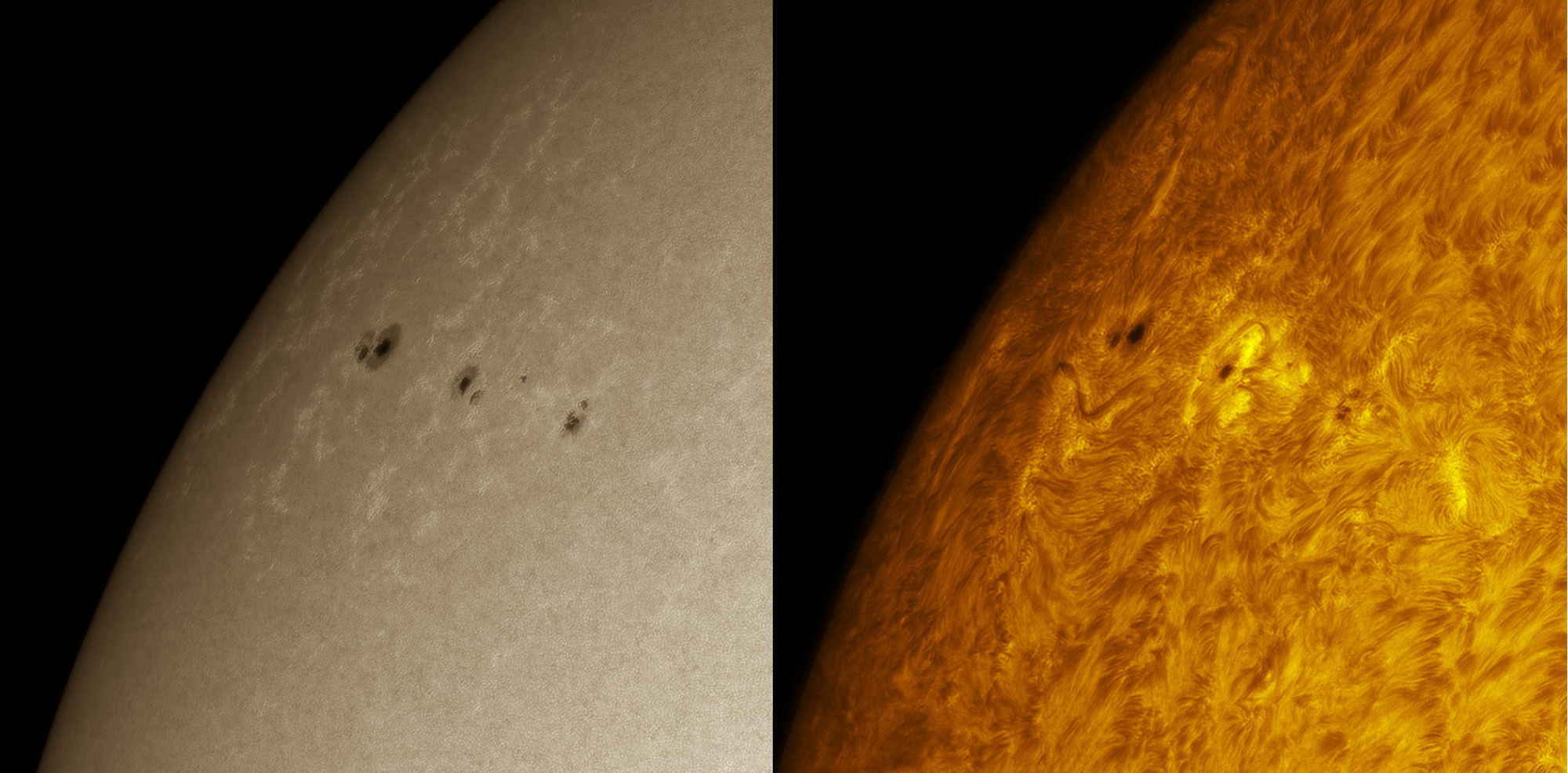 SUN (20220611) WL & H-alpha. LUNT152 F/6, X4 Powermate, DAYSTAR QUARK Chromosphere, ZWO ASI174MM