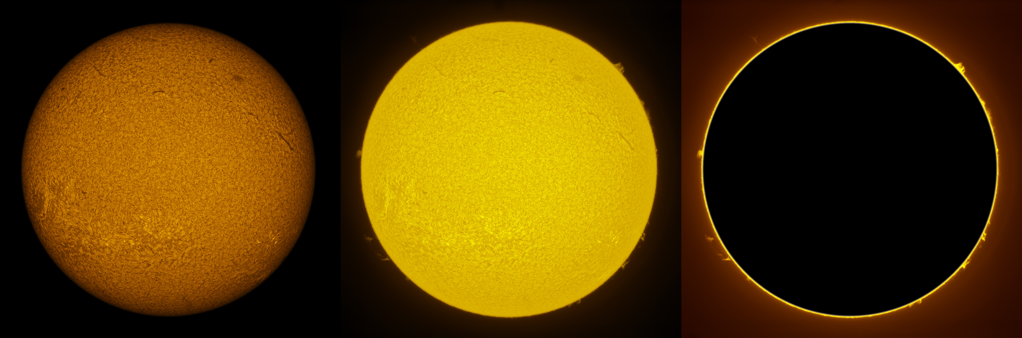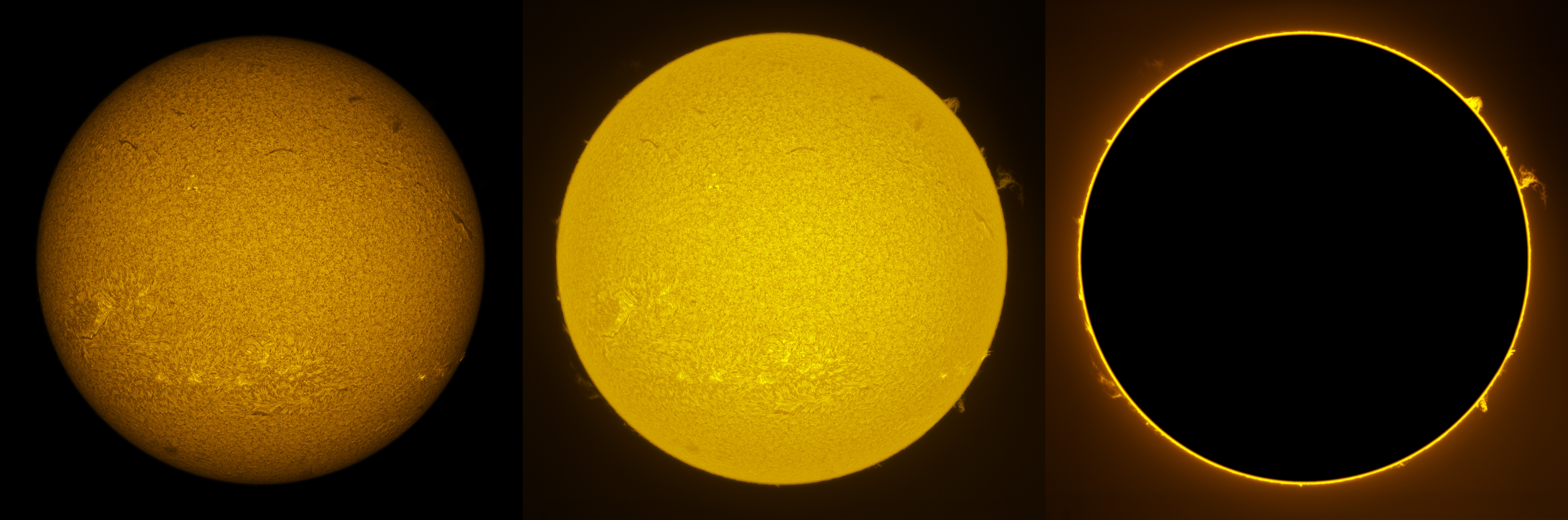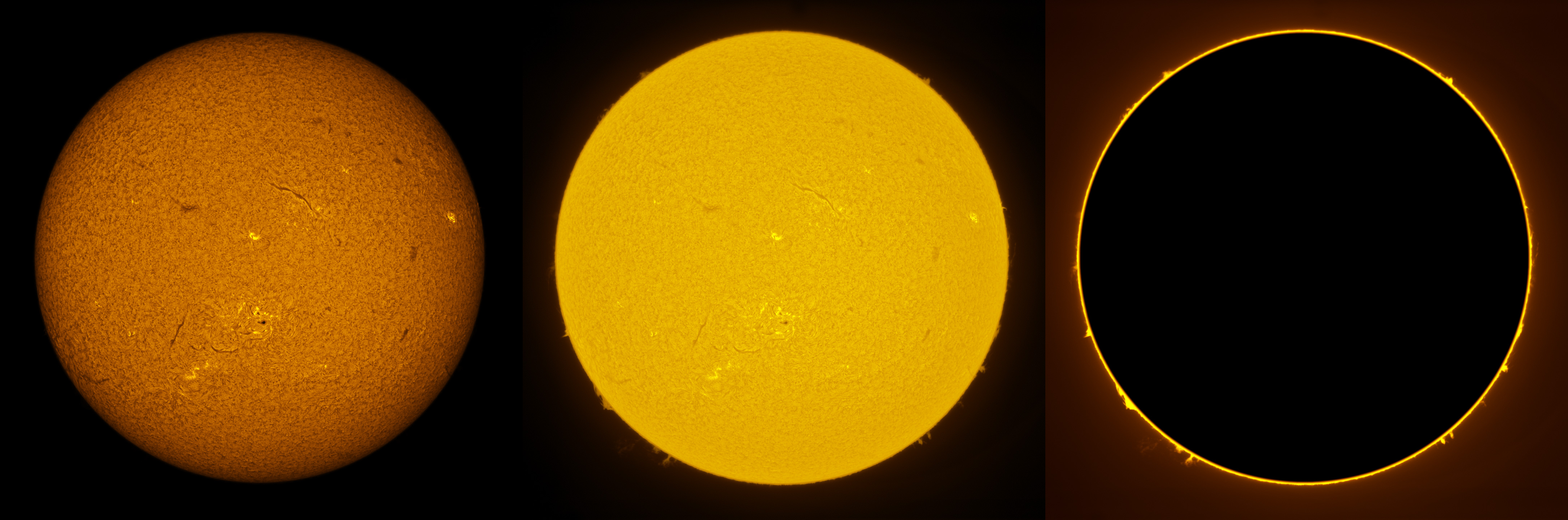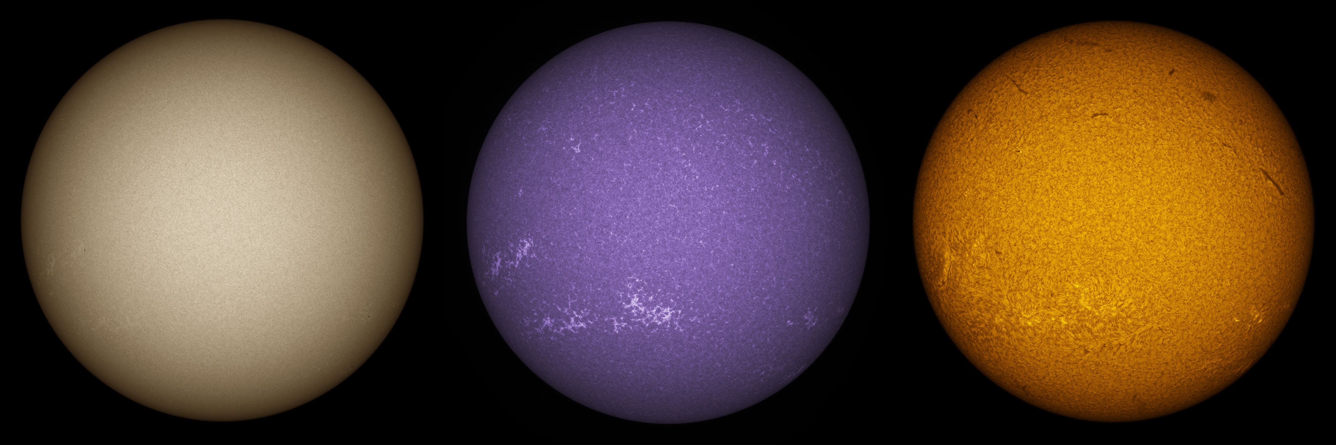 SUN (20220613) WL, CaK & H-alpha (08:00 UTC). TV101 F/5.4, LUNT 1200 CaK Module, SM60, BF30, PGR GRASSHOPPER 3 GS3-U3-28S4M