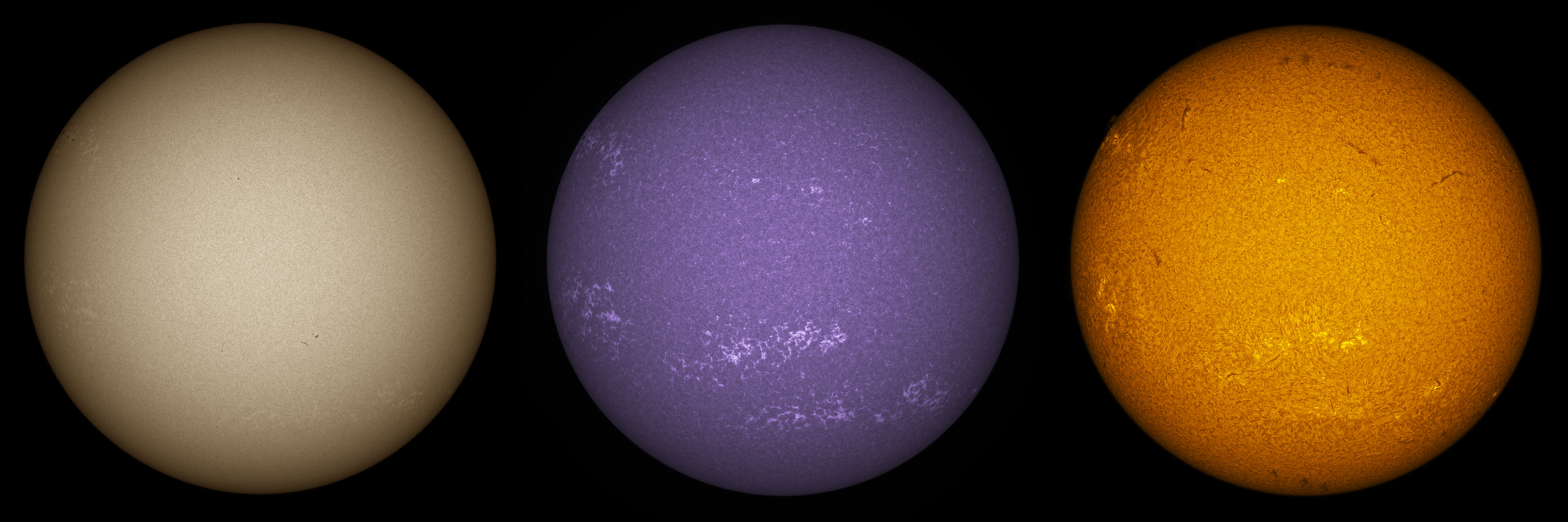 SUN (20220611) WL, CaK & H-alpha (08:00 UTC). TV101 F/5.4, LUNT 1200 CaK Module, SM60, BF30, PGR GRASSHOPPER 3 GS3-U3-28S4M