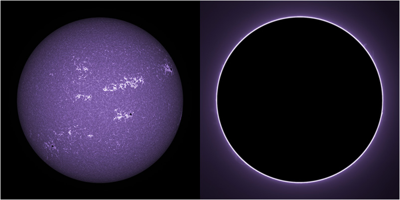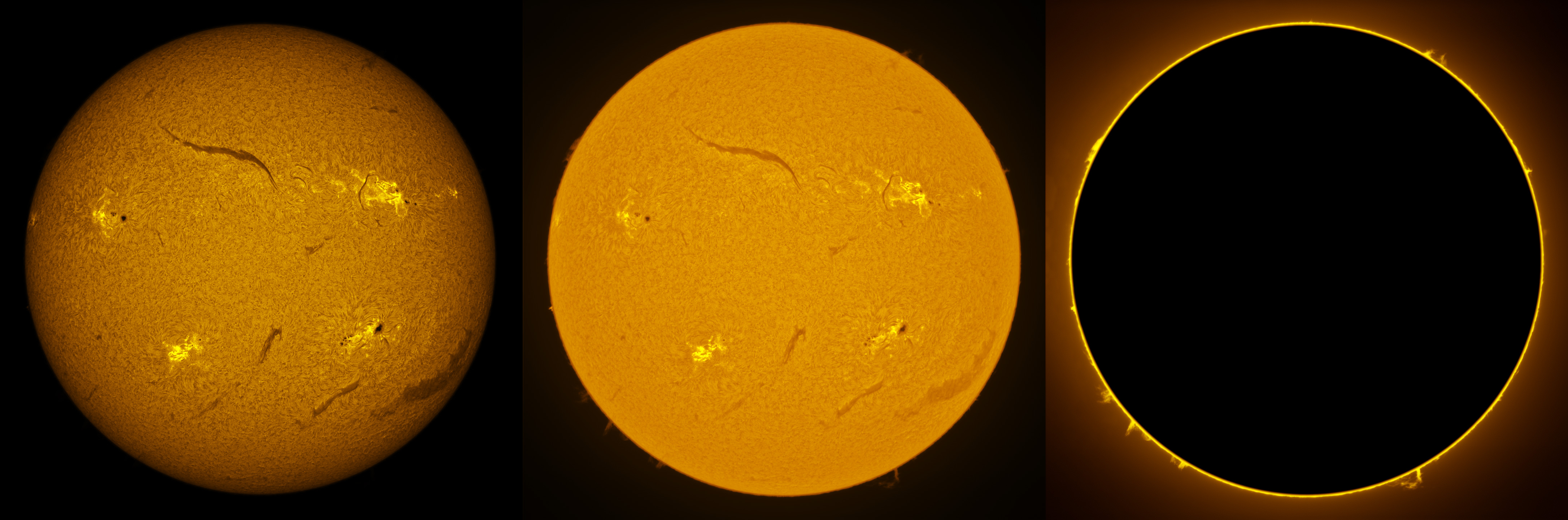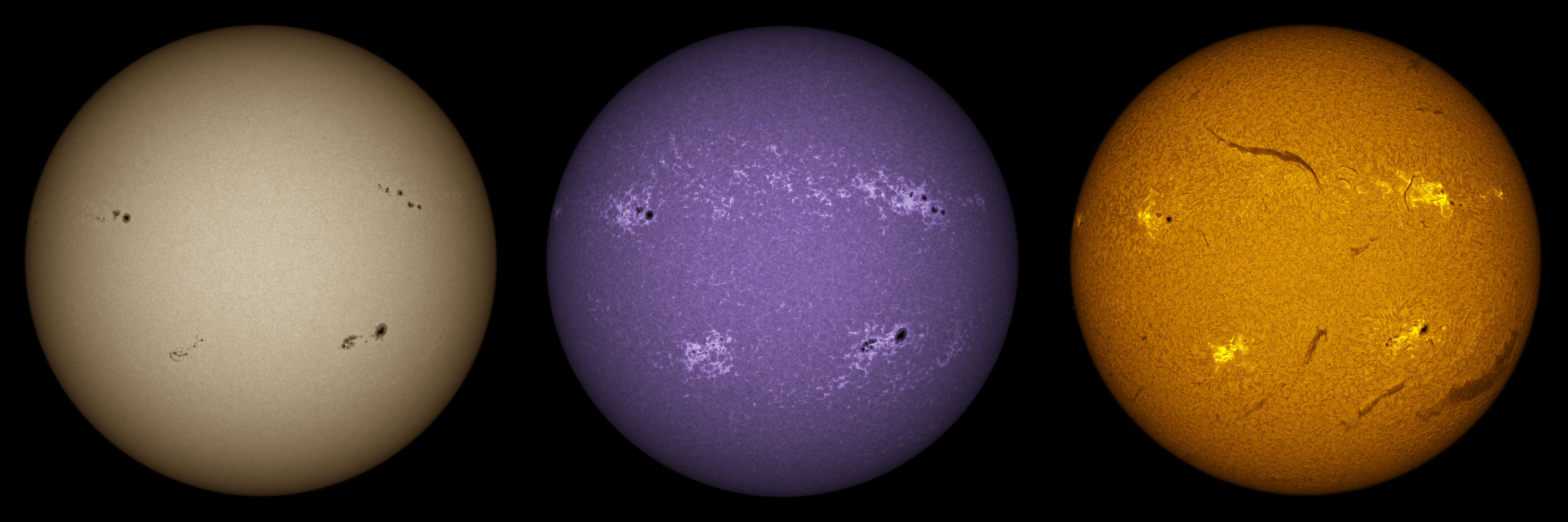 SUN (20220728) WL, CaK & H-alpha (08:30 UTC). TV NP127 F/5.2, LUNT 1200 CaK Module, SM60, BF30, PGR GRASSHOPPER 3 GS3-U3-28S5M