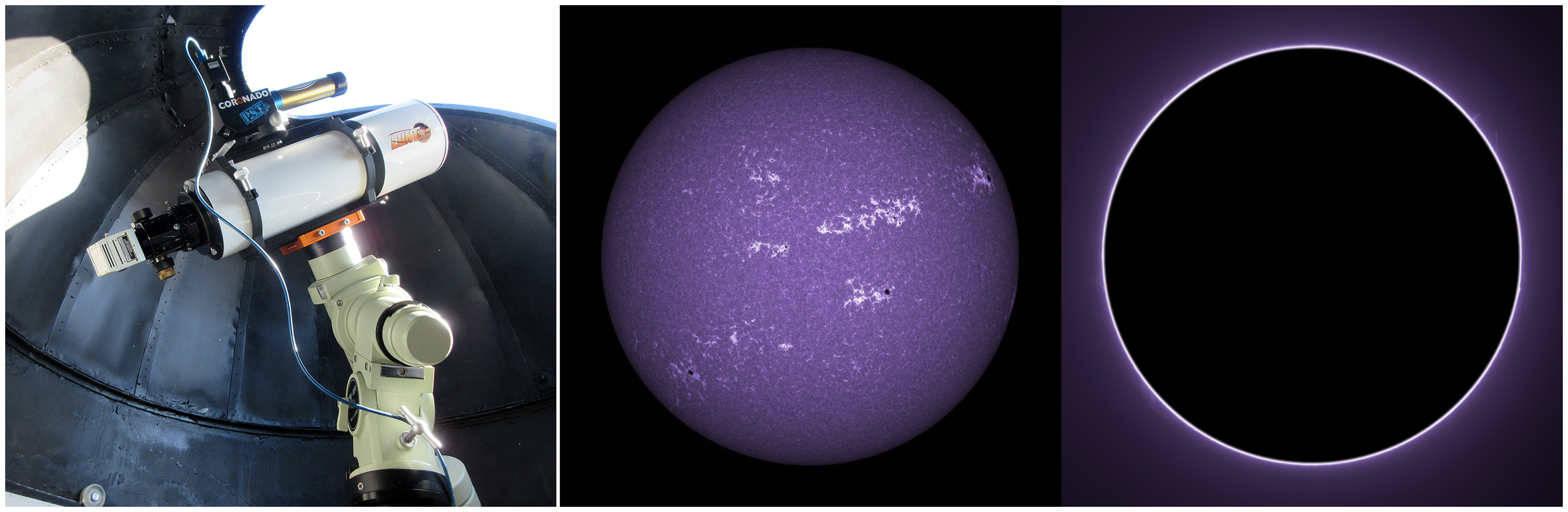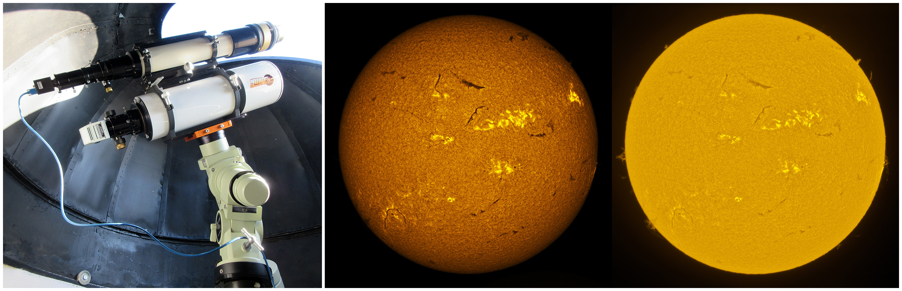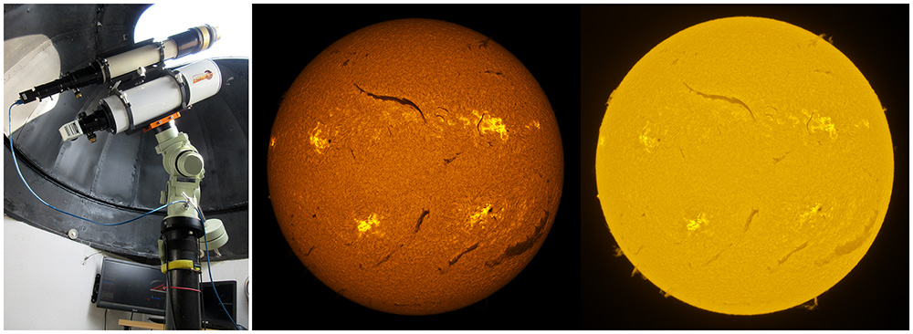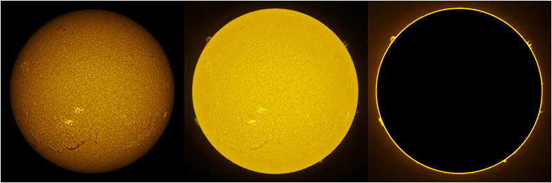 SUN (20220714) WL, CaK & H-alpha (09:30 UTC). TV101 F/5.4, LUNT 1200 CaK Module, SM60, BF30, PGR GRASSHOPPER 3 GS3-U3-28S4M