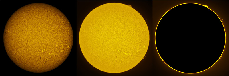 SUN (20220715) WL, CaK & H-alpha (07:30 UTC). TV101 F/5.4, LUNT 1200 CaK Module, SM60, BF30, PGR GRASSHOPPER 3 GS3-U3-28S4M