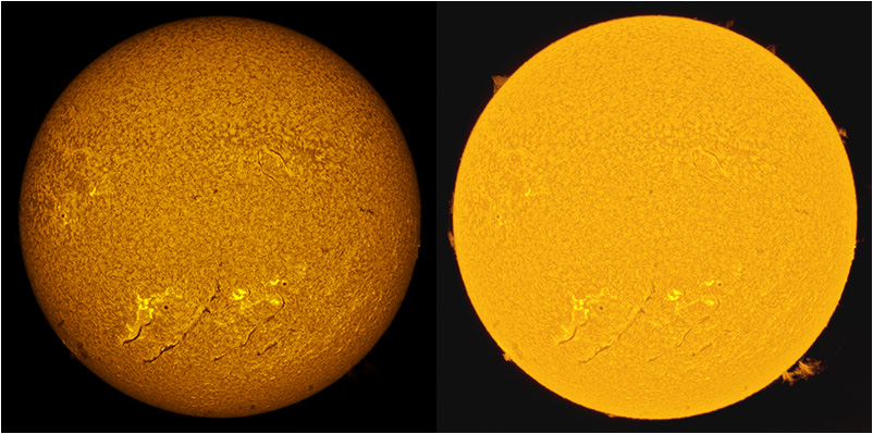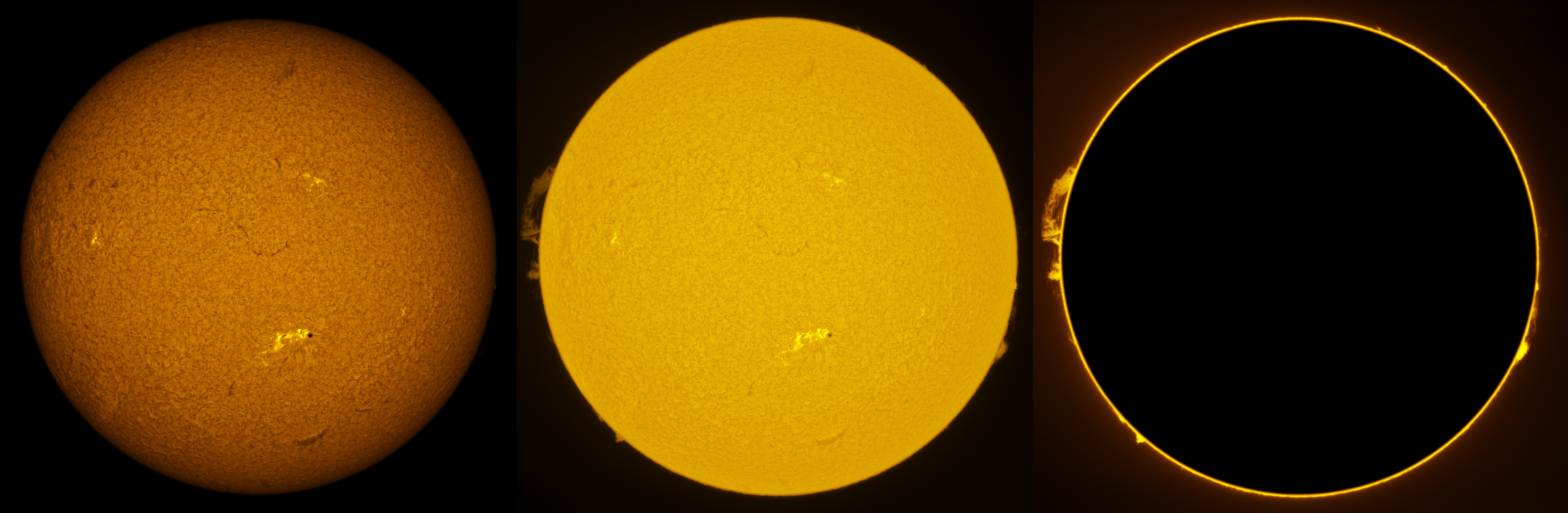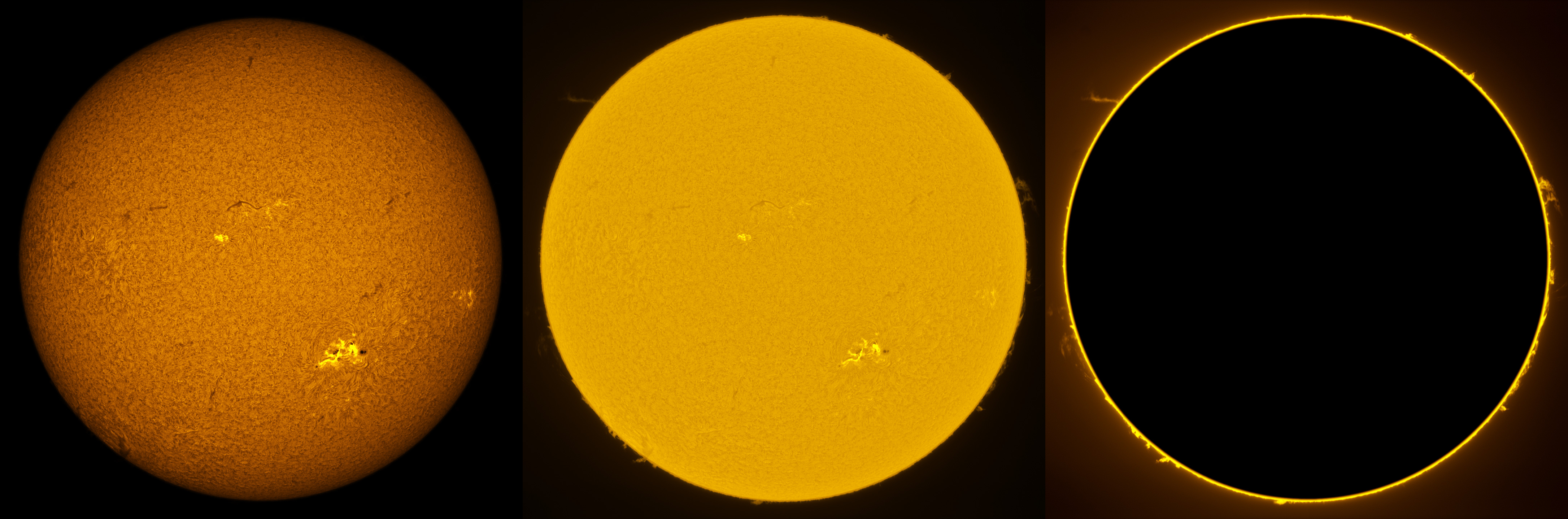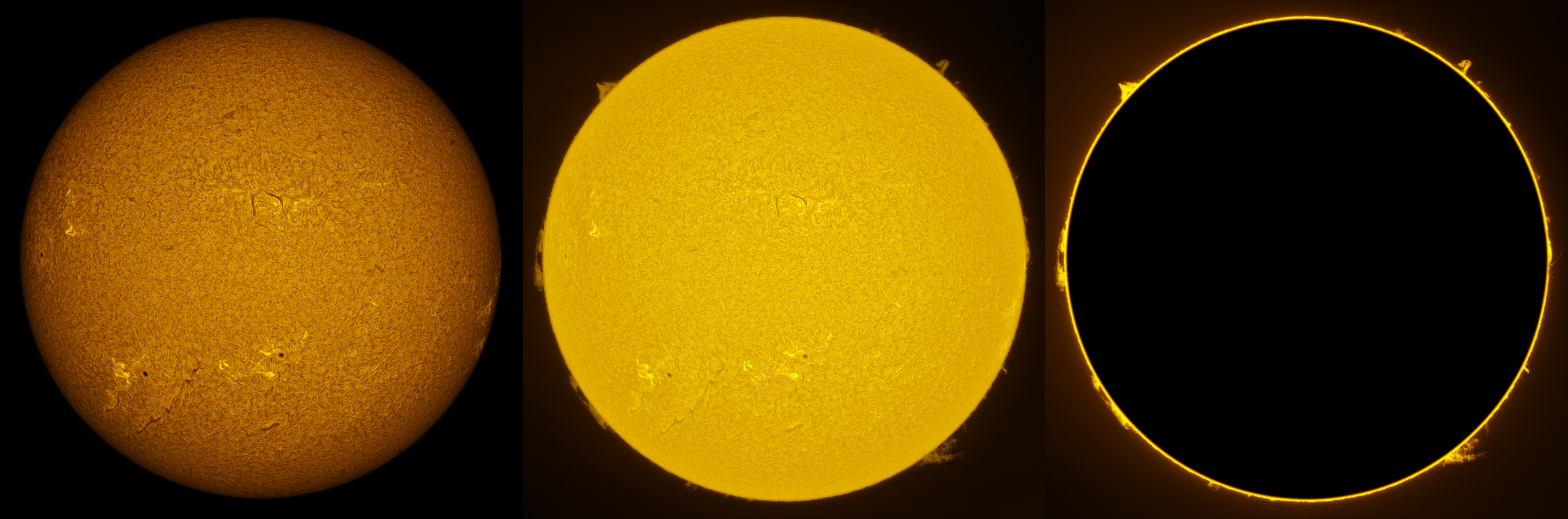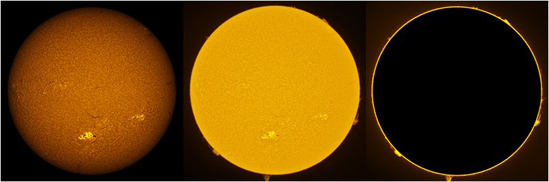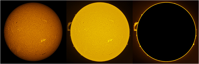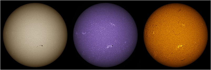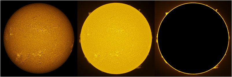 SUN (20220801) WL, CaK & H-alpha (08:30 UTC). TV NP127 F/5.2, LUNT 1200 CaK Module, SM60, BF30, PGR GRASSHOPPER 3 GS3-U3-28S5M