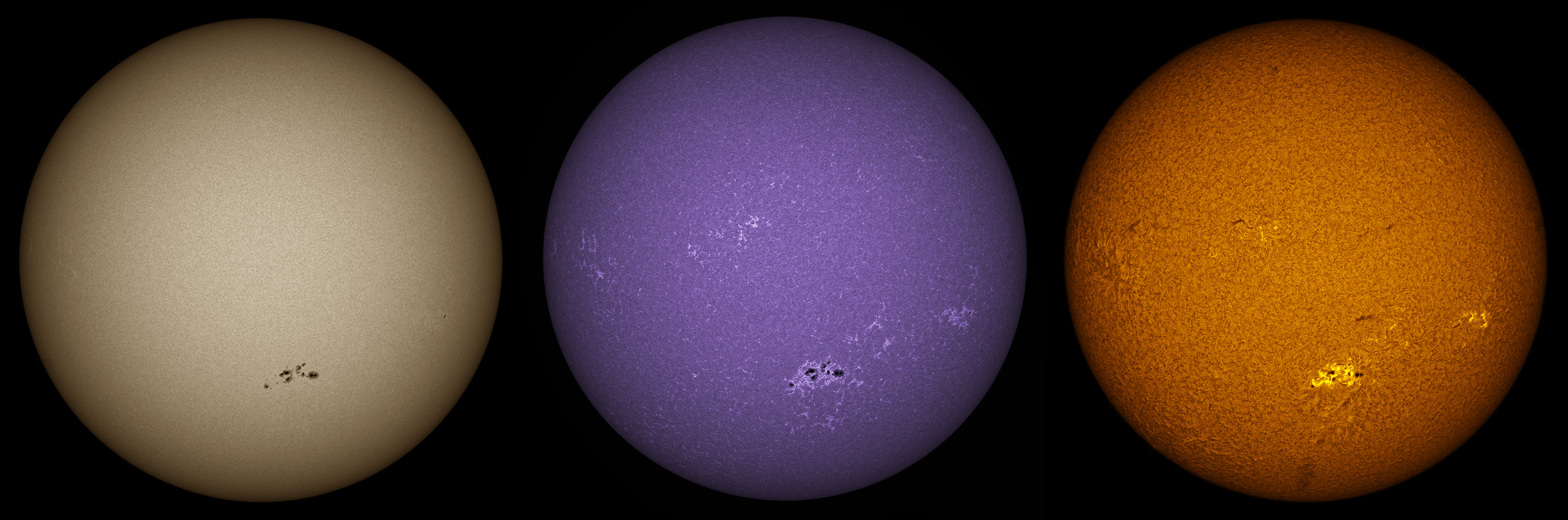 SUN (20220829) WL, CaK & H-alpha (11:00 UTC). TV NP127 F/5.2, LUNT 1200 CaK Module, SM60, BF30, PGR GRASSHOPPER 3 GS3-U3-28S5M
